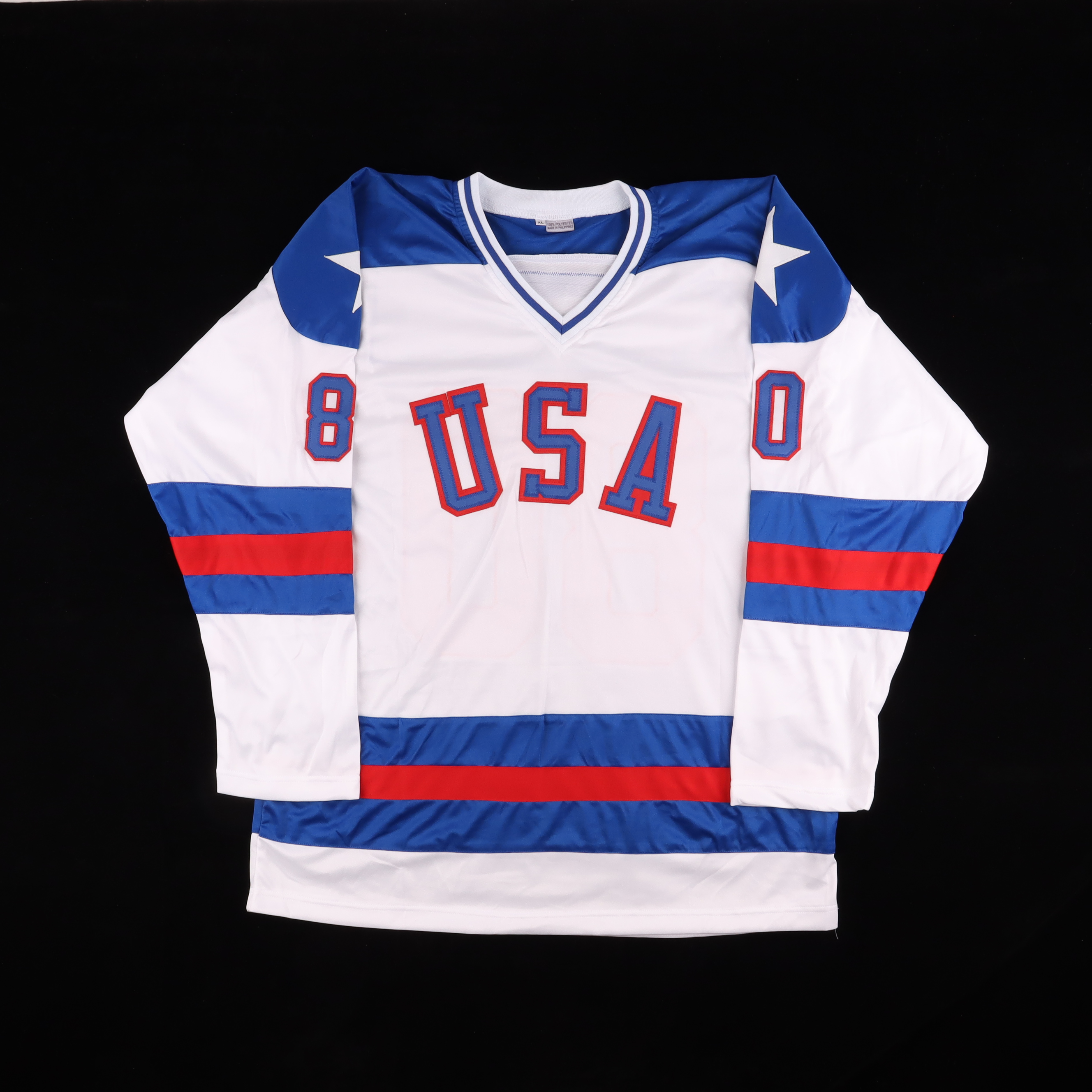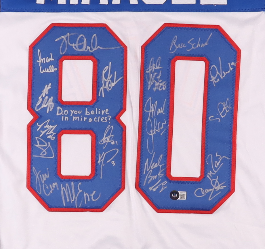 Custom on-ice style jersey. Everything sewn on, size XL. Hand-signed and inscribed by (19) with Steve Janaszak, Bill Baker, Dave Christian, Ken Morrow, Jack O'Callahan, Mike Ramsey, Neal Broten, Steve Christoff, Mike Eruzione, John Harrington, Mark Johnson, Rob McClanahan, Buzz Schneider, Dave Silk, Eric Strobel, Phil Verchota, Mark Wells, Craig Patrick and Jim Craig.