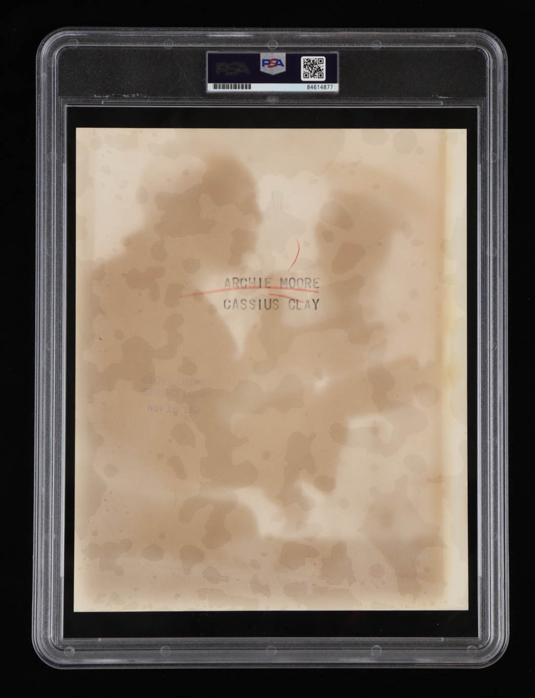 Photo measures 8" x 10" in size and features Muhammad Ali (D.2016, HOF) and Archie Moore (D.1998, HOF). Please note, this item is unsigned and the writing on the back is by an unknown hand.
