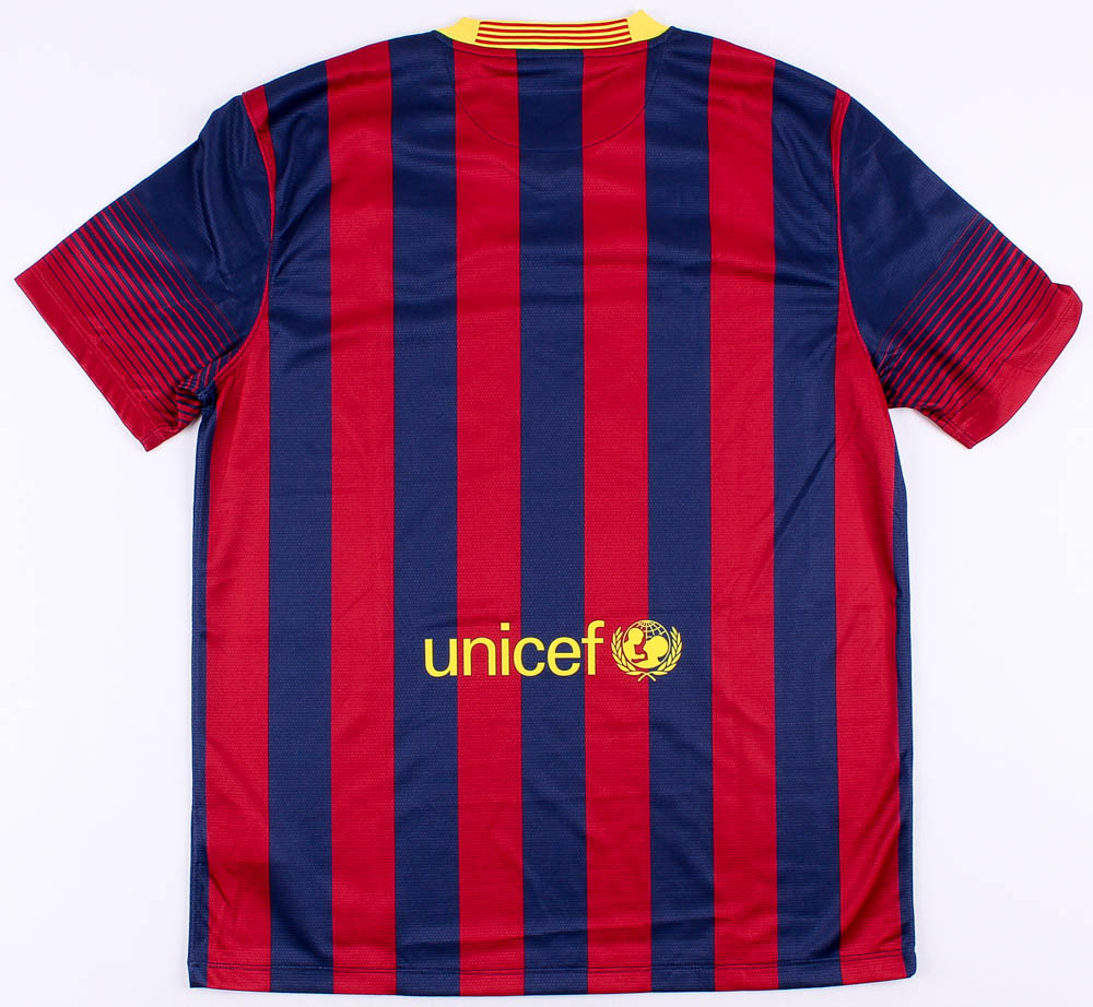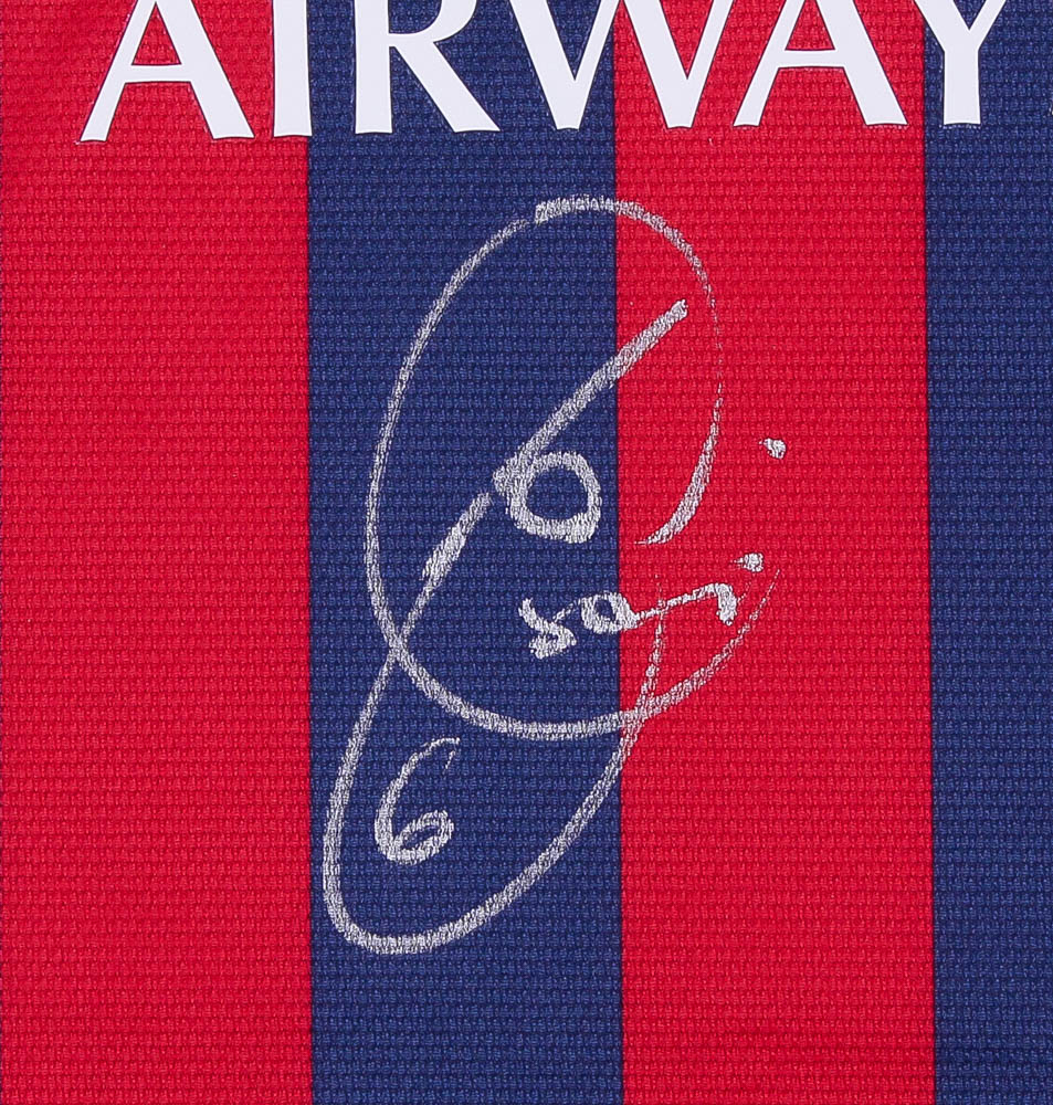 Nike dri-fit on-field style jersey. Patches are sewn on, "Unicef" & "Qatar Airways" are printed on, size L. Hand-signed in silver paint pen by Xavi Hernandez.