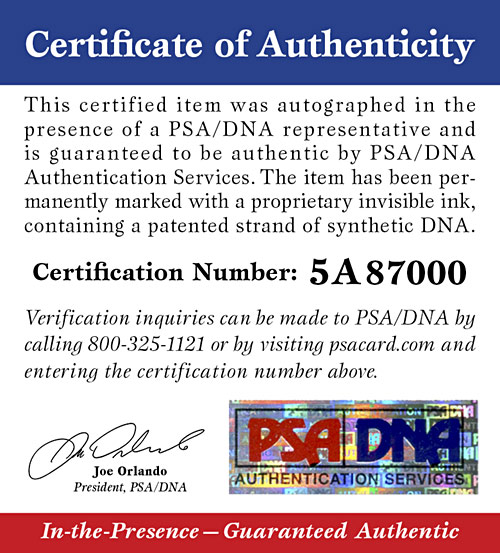 The autograph includes an official PSA/DNA hologram and matching COA for authenticity purposes. The signing of this item was witnessed by PSA.