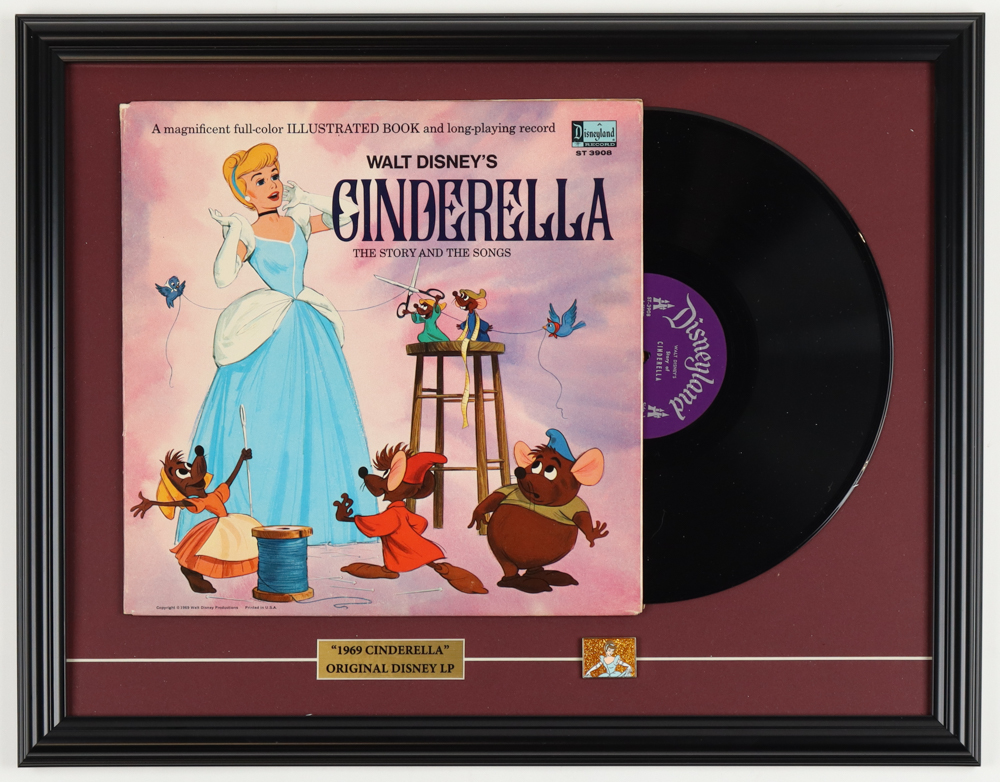Custom framed display measures 18" x 22" in size and features an original 1969 Disneyland "Cinderella" vinyl record.