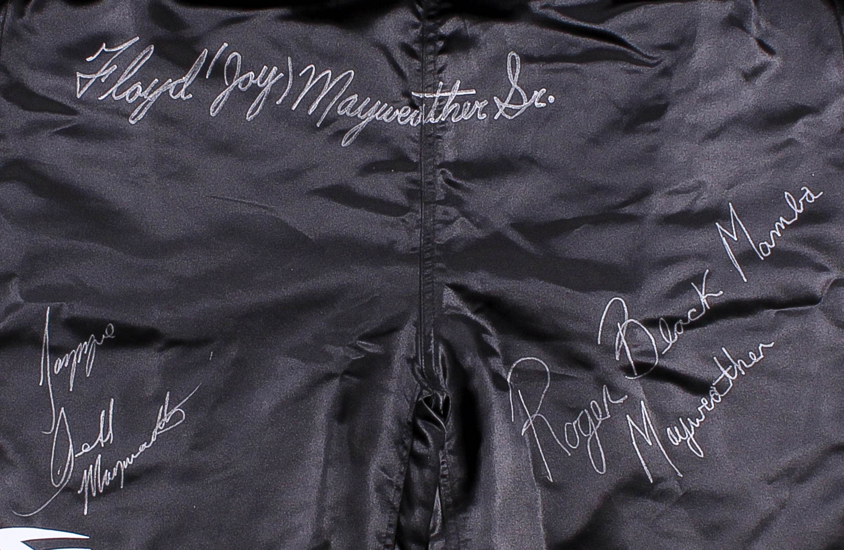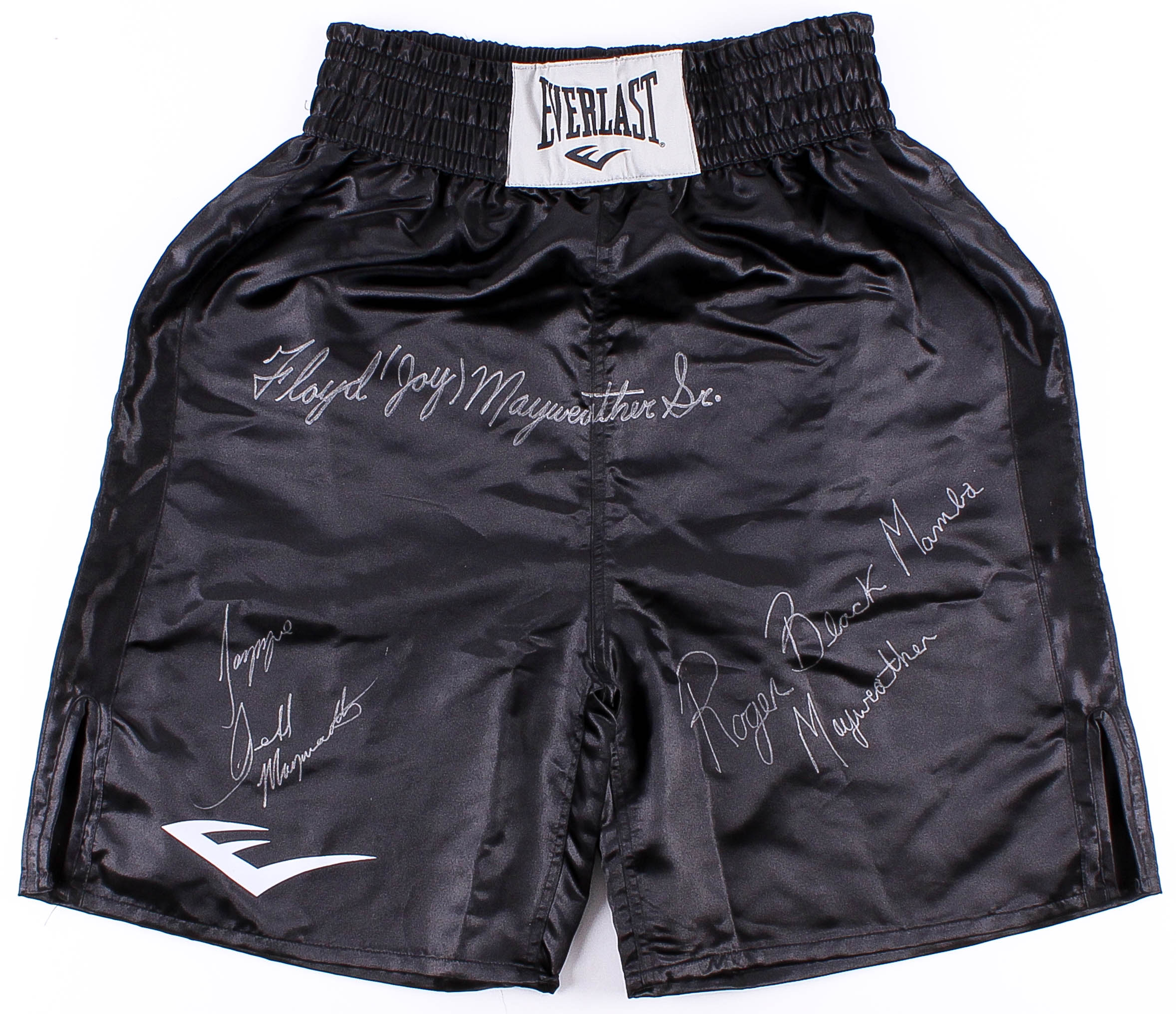 Everlast boxing shorts, size XL. Hand-signed and inscribed in silver paint pen by Floyd Mayweather Sr., Roger "Black Mamba" Mayweather & "Jazzy" Jeff Mayweather.