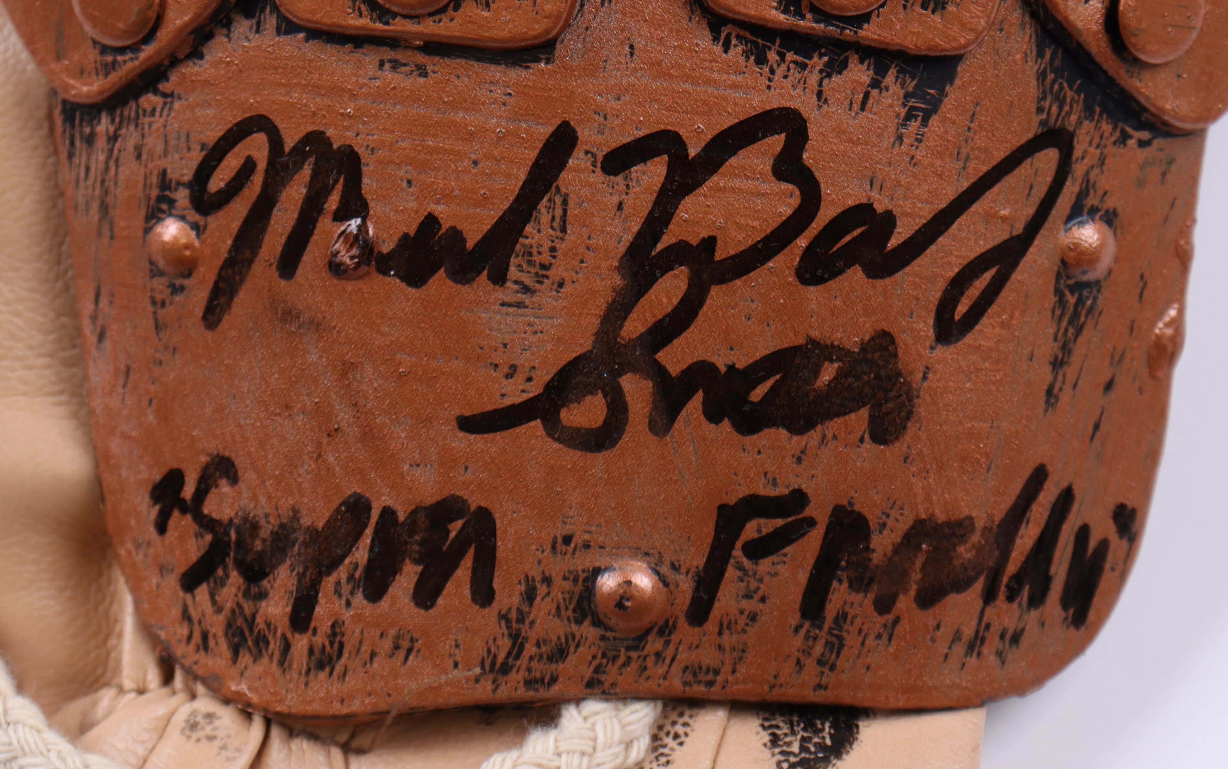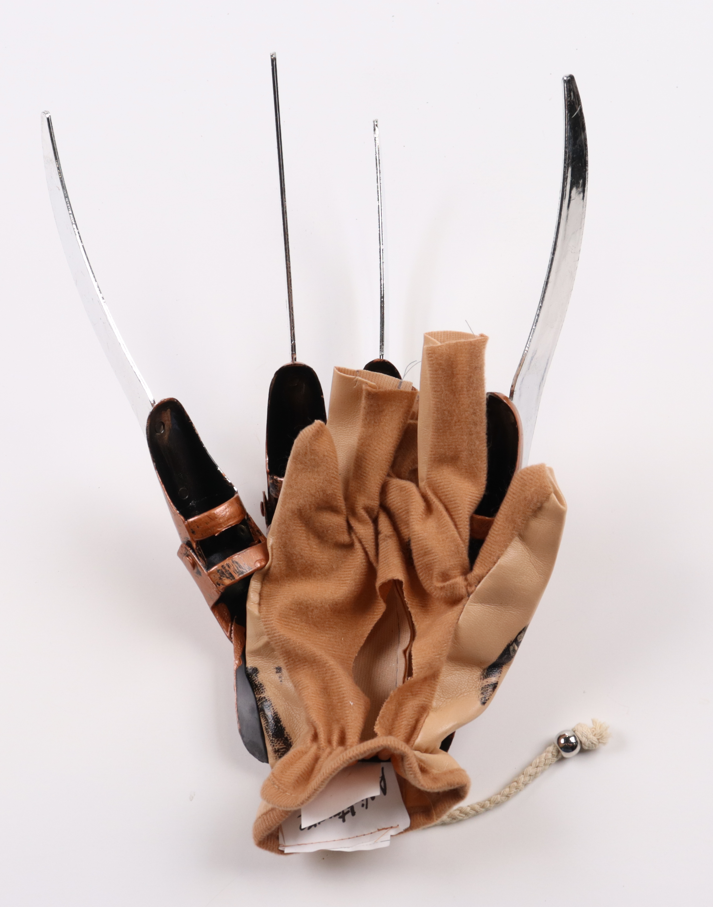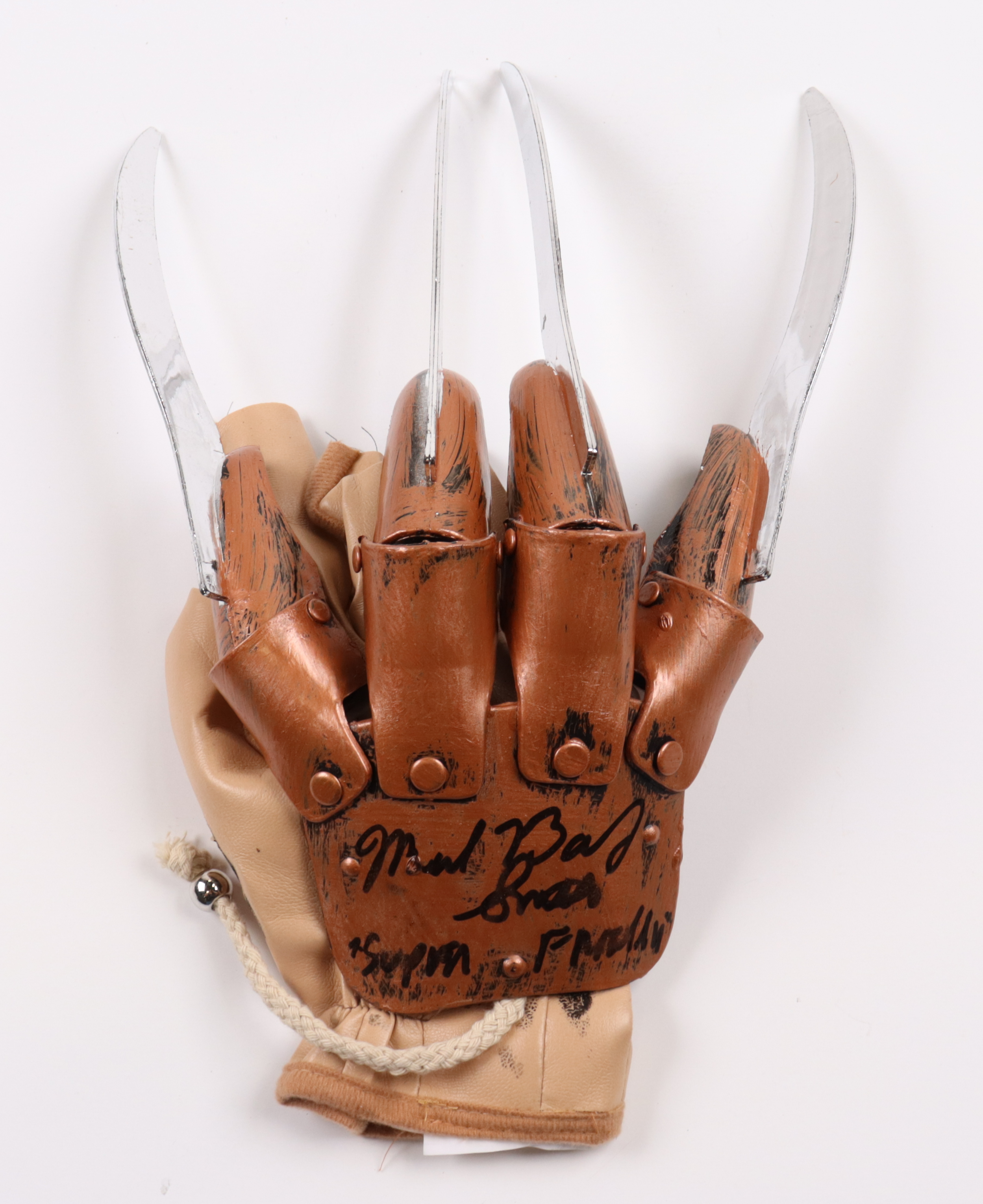 Freddy Krueger replica glove. Hand-signed and inscribed by Michael Bailey Smith. Please note, the autograph and inscription are smudged.