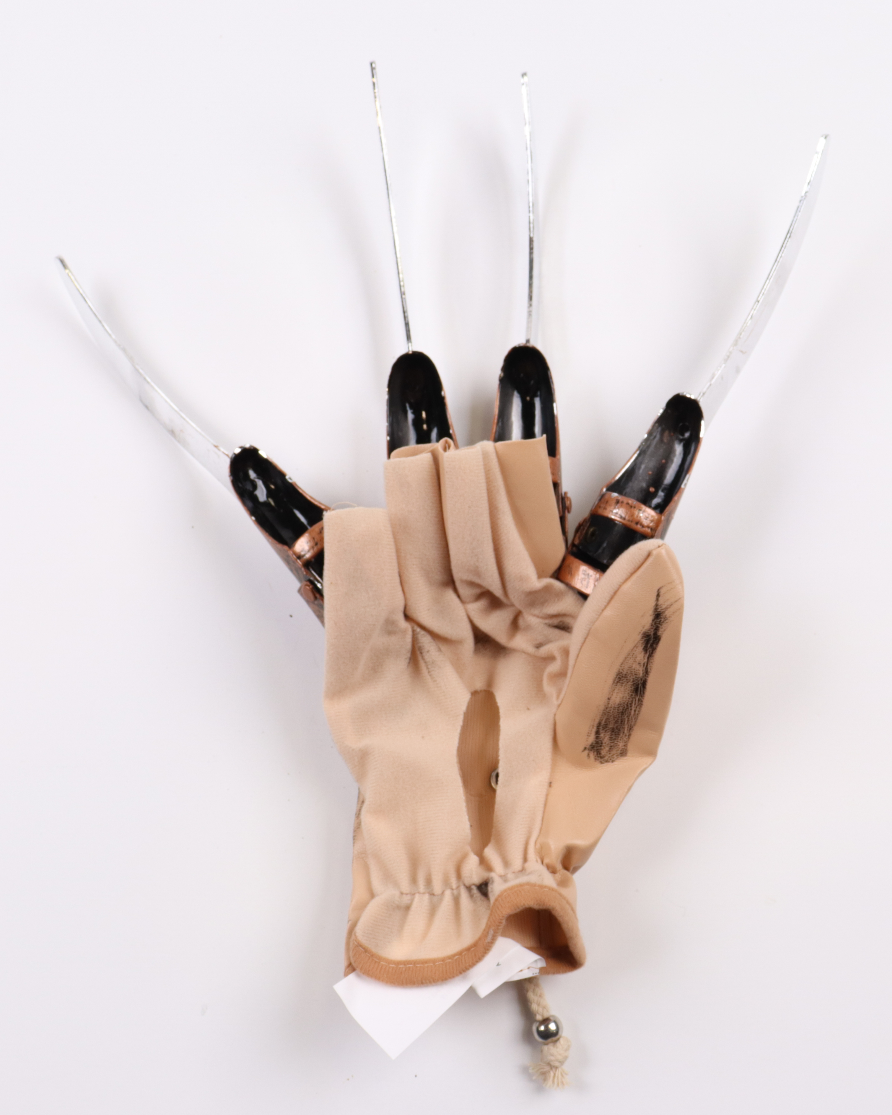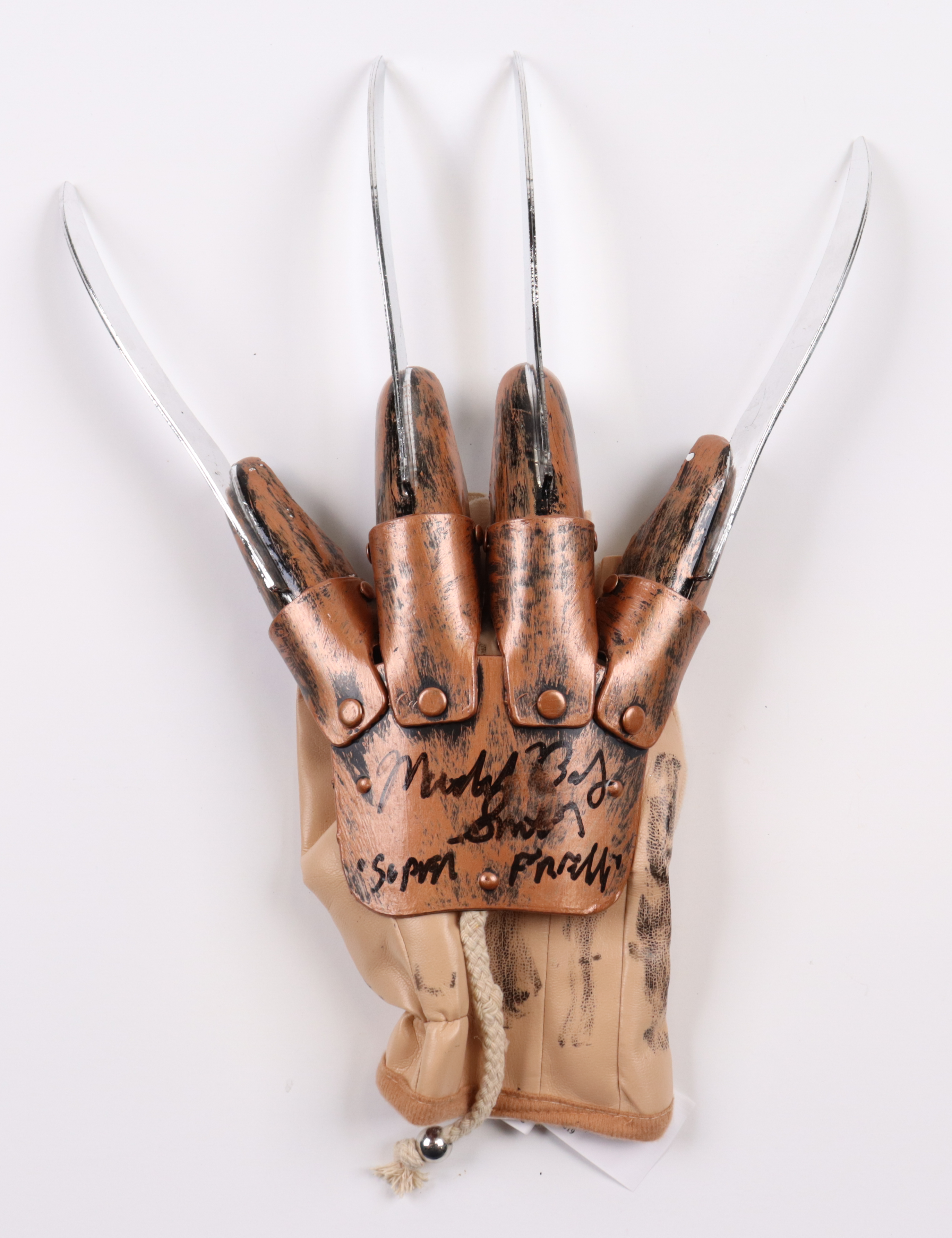 Freddy Krueger replica glove. Hand-signed and inscribed by Michael Bailey Smith. Please note, the autograph is smudged and there is staining on the underside of the glove.
