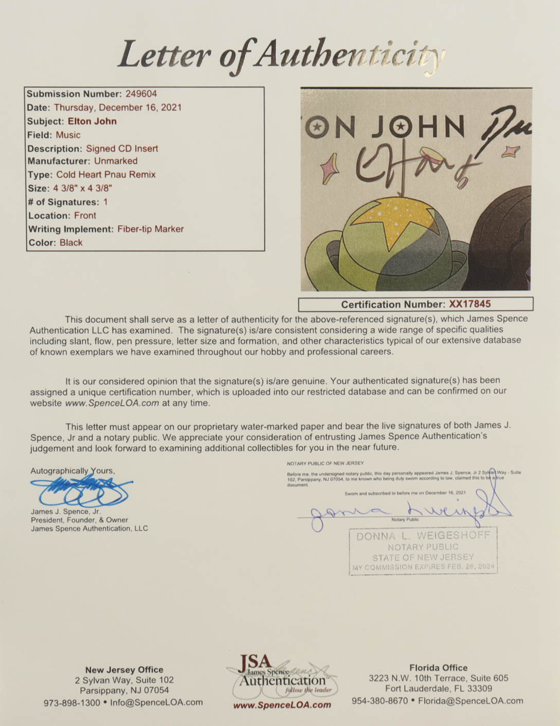 Elton John Signed "Cold Heart PNAU Remix" Custom Framed CD Disc Cover Display (JSA)