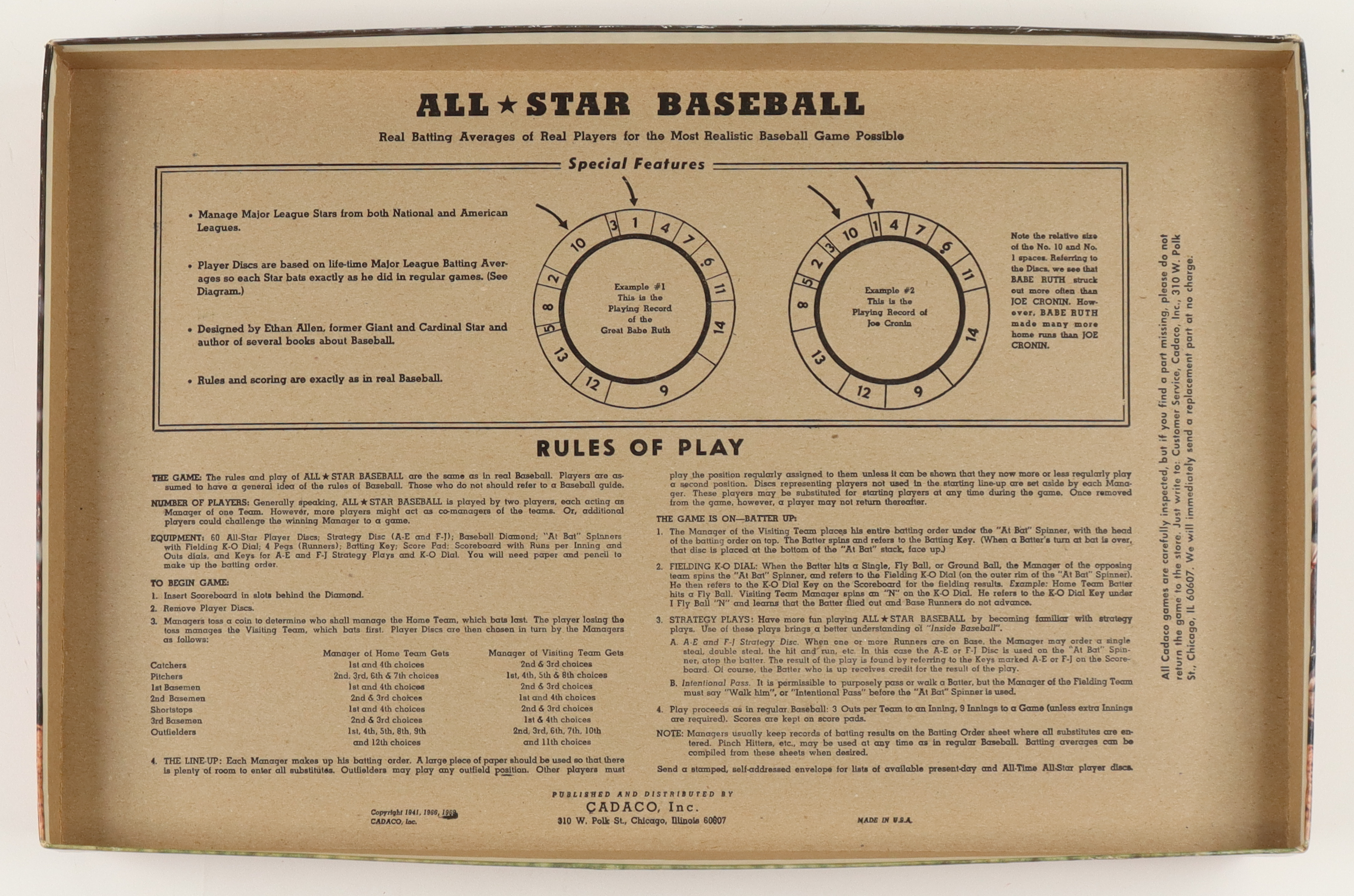 Vintage 1968 Cadaco MLB All-Star baseball board game. Original box measures 12.5" x 19" in size. Please see photos for more details. Please note, the original box shows signs of natural aging.
