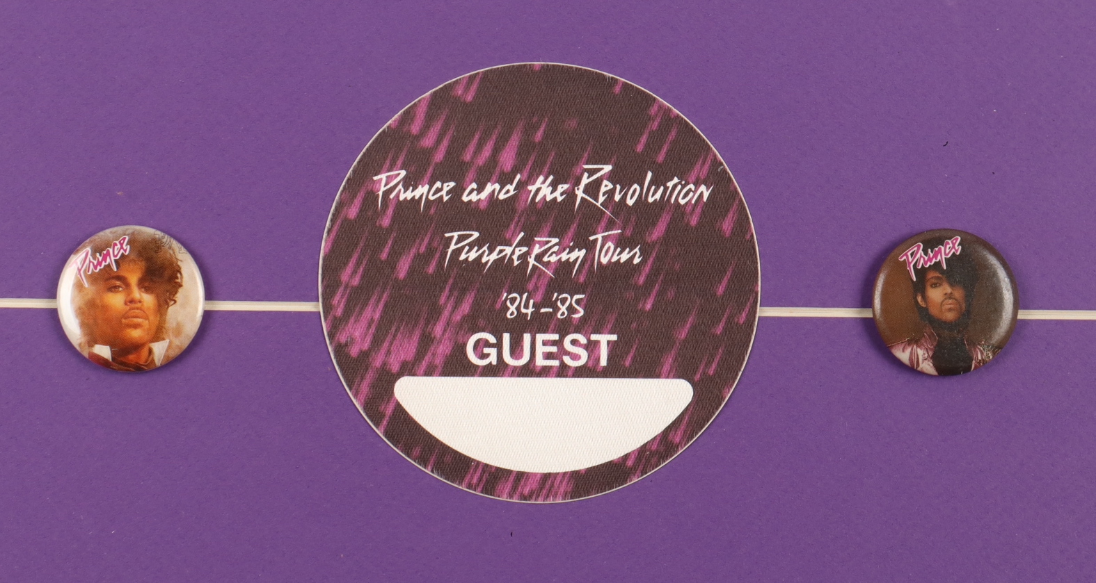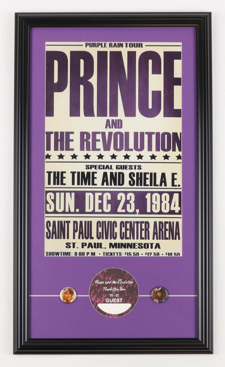 Custom framed display measures 15" x 26" and features a "Prince and The Revolution: Purple Rain Tour" poster print. Display also features an original backstage pass from the 1984-85 Purple Rain Tour as well as (2) Prince Pins. Please see photos for details.