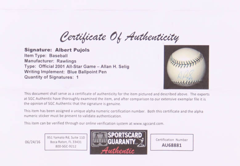 Rawlings Official 2001 All-Star Game Baseball has been hand-signed by Albert Pujols (St. Louis Cardinals). Display case is included as shown. Please note, the baseball shows signs of natural toning.