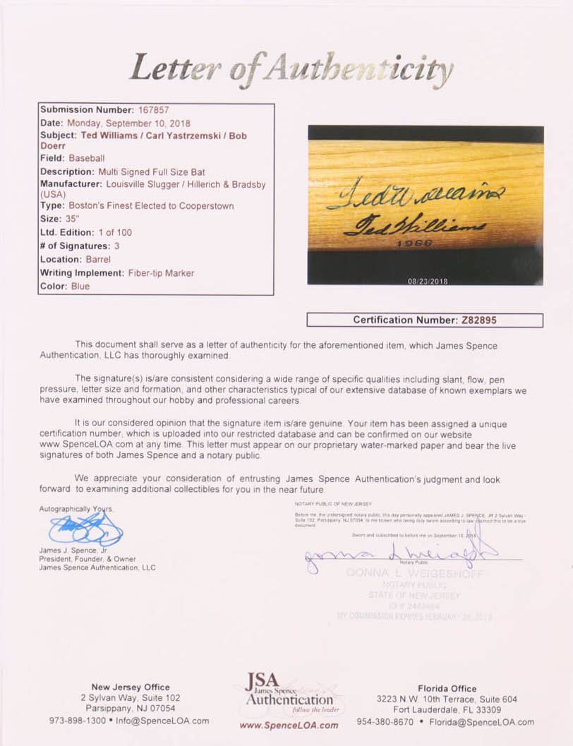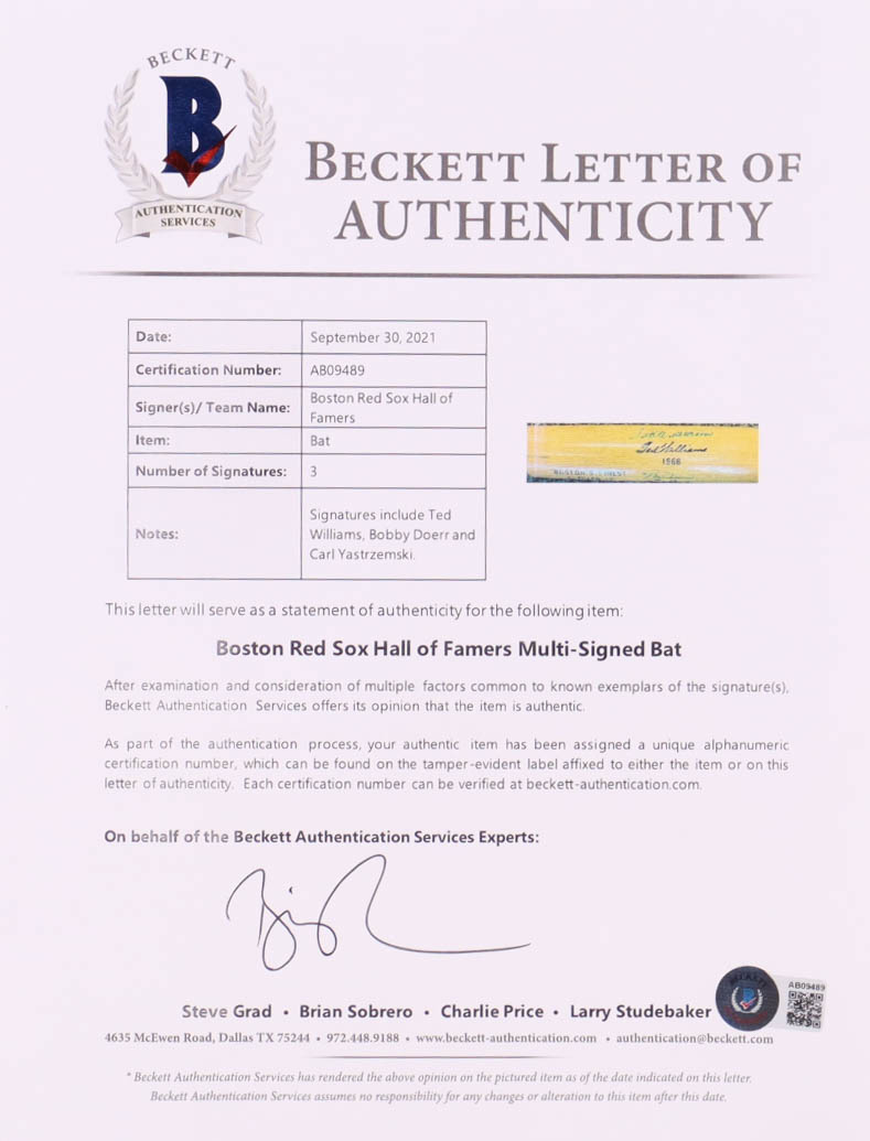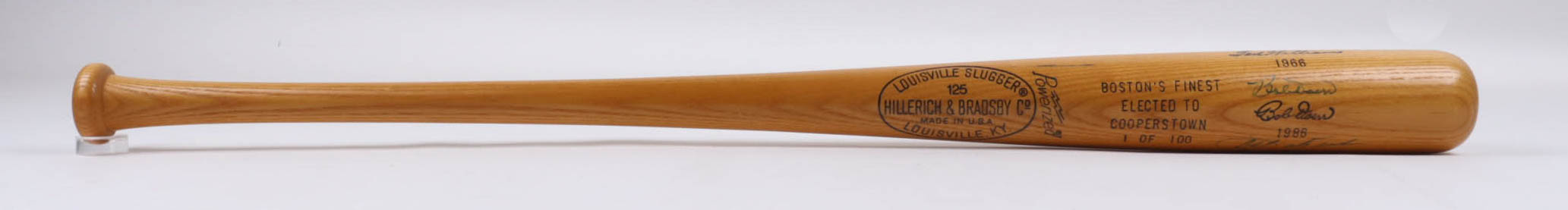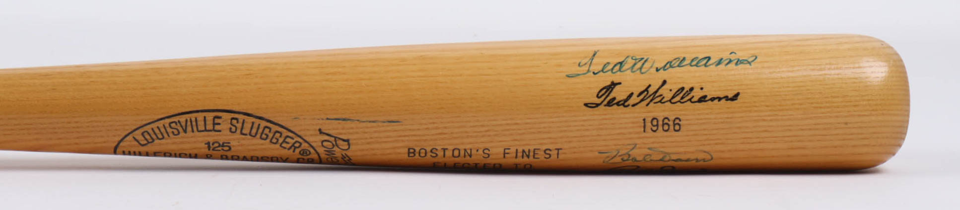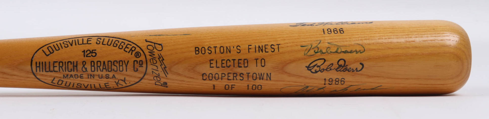 Louisville Slugger Powerized Player Model baseball bat. Hand-signed by Ted Williams (D.2002, Boston Red Sox, HOF), Bobby Doerr (D.2017, Boston Red Sox, HOF) and Carl Yastrzemski (Boston Red Sox, HOF).
