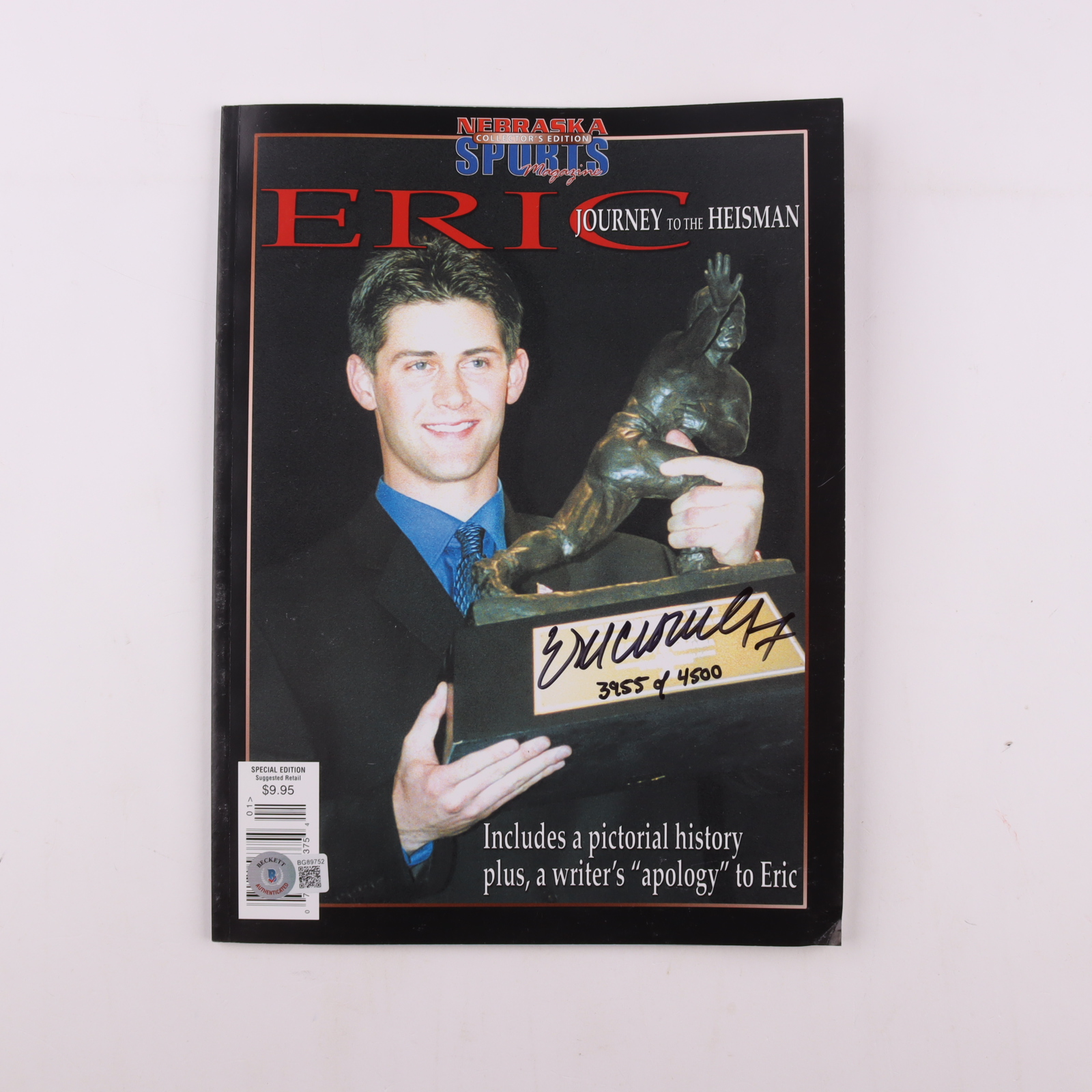 2001 issue of Nebraska Sports Magazine Collector's Edition has been hand-signed on the cover by Eric Crouch (Nebraska Cornhuskers). Please note, the item is limited edition hand-numbered #3955/4500.
