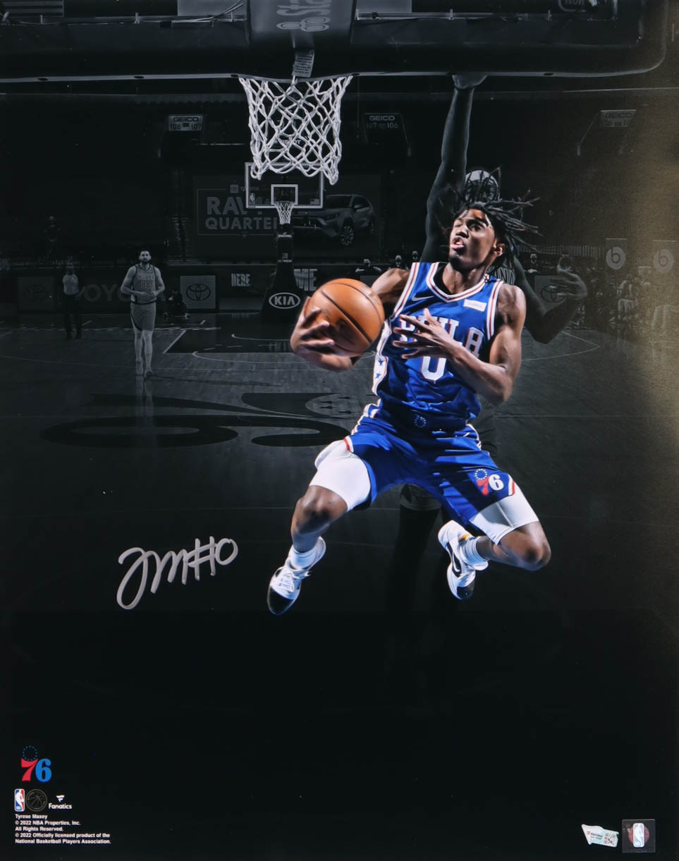 Photo measures 16" x 20" in size and has been hand-signed by Tyrese Maxey (Philadelphia 76ers).