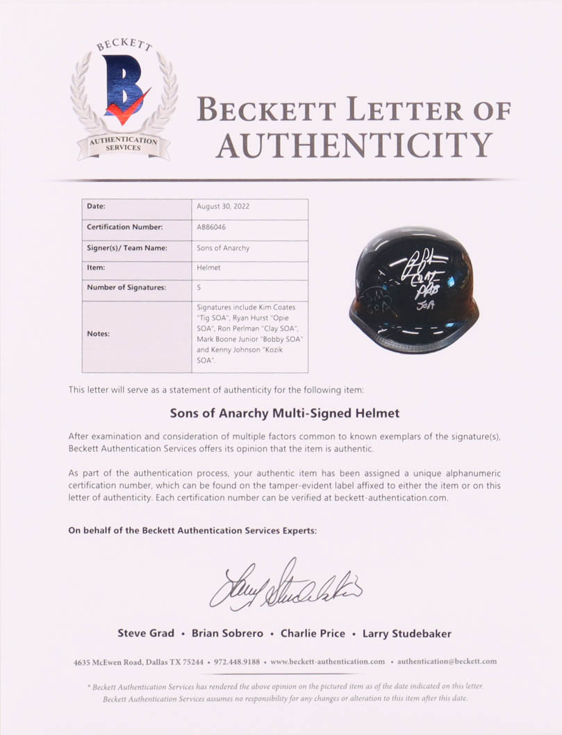 "Sons of Anarchy" Motorcycle Helmet has been hand-signed and inscribed by Kim Coates (Alexander "Tig" Trager), Ryan Hurst (Harry 'Opie' Winston), Ron Perlman (Clarence 'Clay' Morrow), Mark Boone Junior (Robert 'Bobby Elvis' Munson), and Kenny Johnson (Herman Kozik).