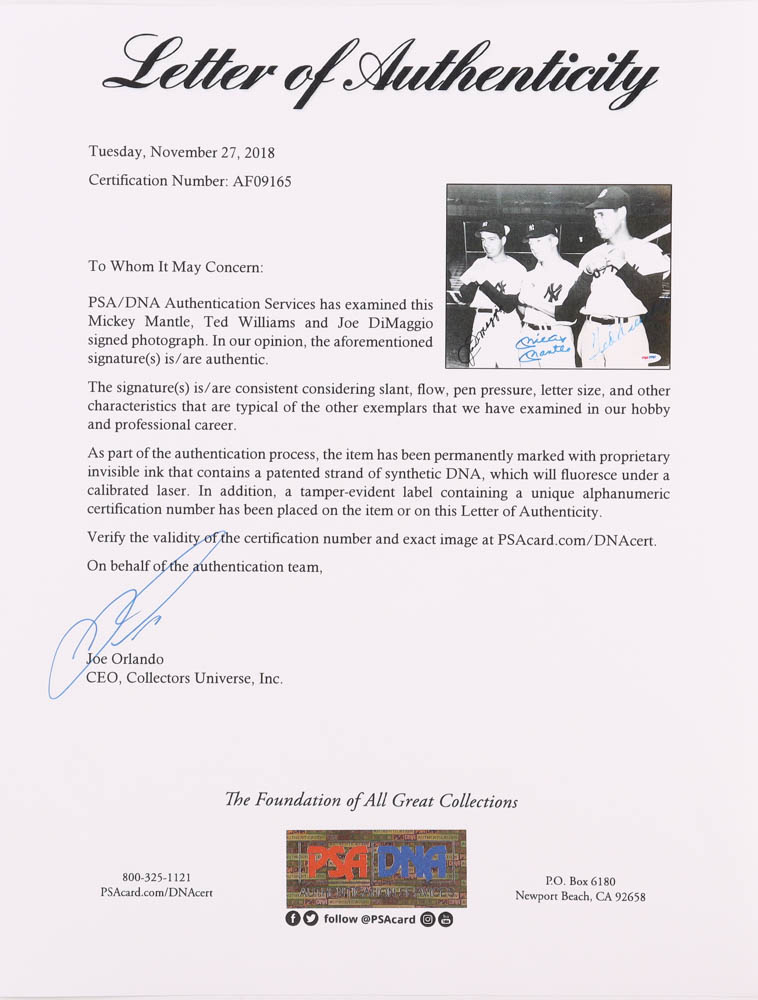 Photo measures 8" x 10" in size. Hand-signed by Mickey Mantle (D. 1995, New York Yankees, HOF), Ted Williams (D. 2002, Boston Red Sox, HOF), and Joe DiMaggio (D. 1999, New York Yankees, HOF).