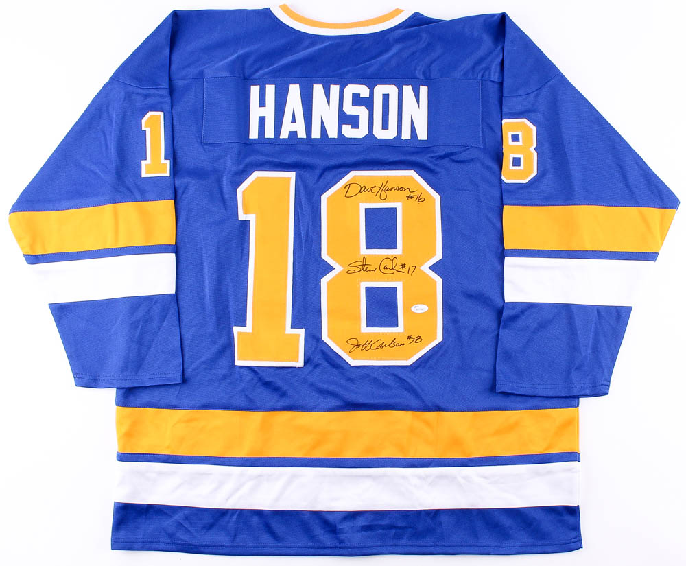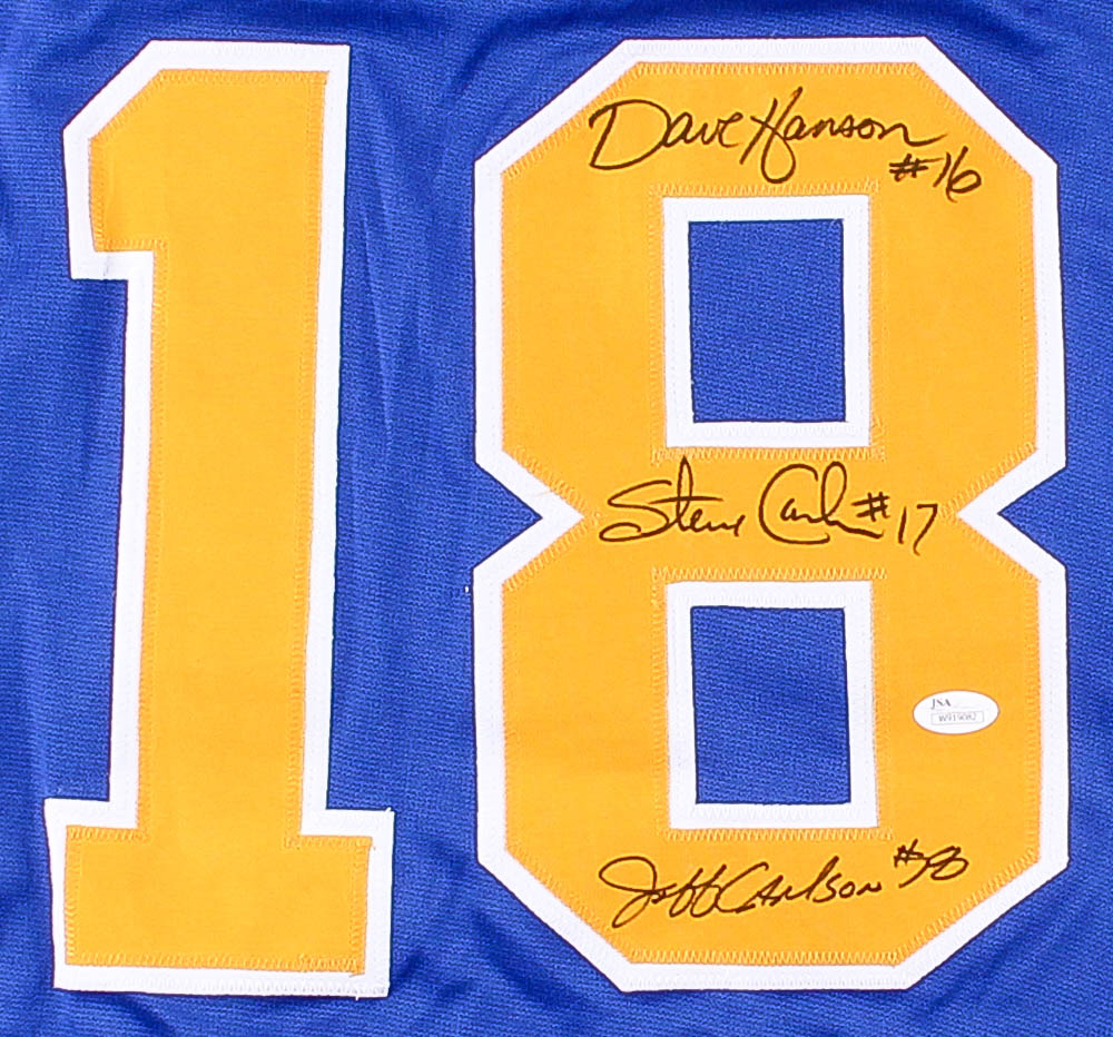 Custom on-ice style jersey. Everything sewn on, size XL. Hand-signed in black felt-tip pen by Dave Hanson, Steve Carlson, and Jeff Carlson.