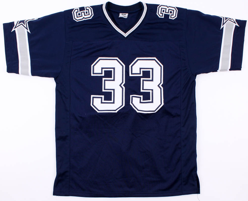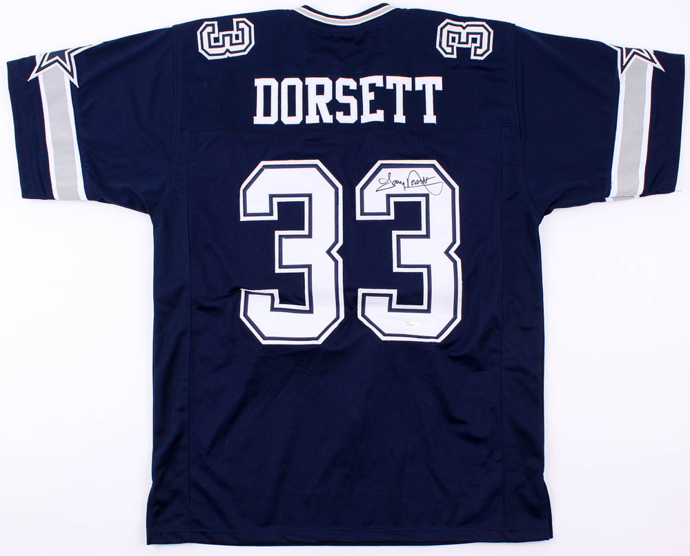 Custom on-field style jersey. Everything is sewn on, size XL. Hand-signed in black felt-tip pen by Tony Dorsett (HOF).