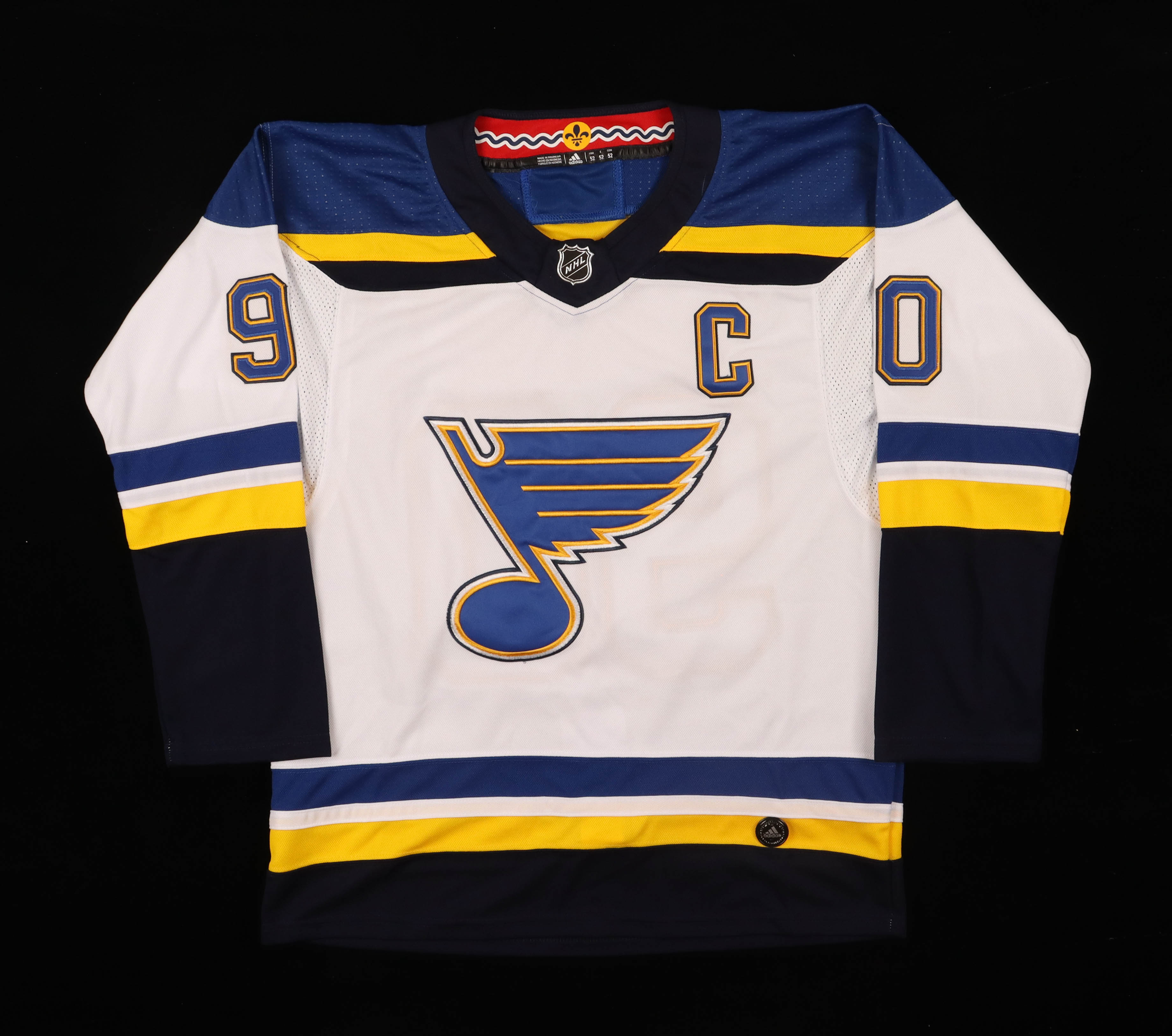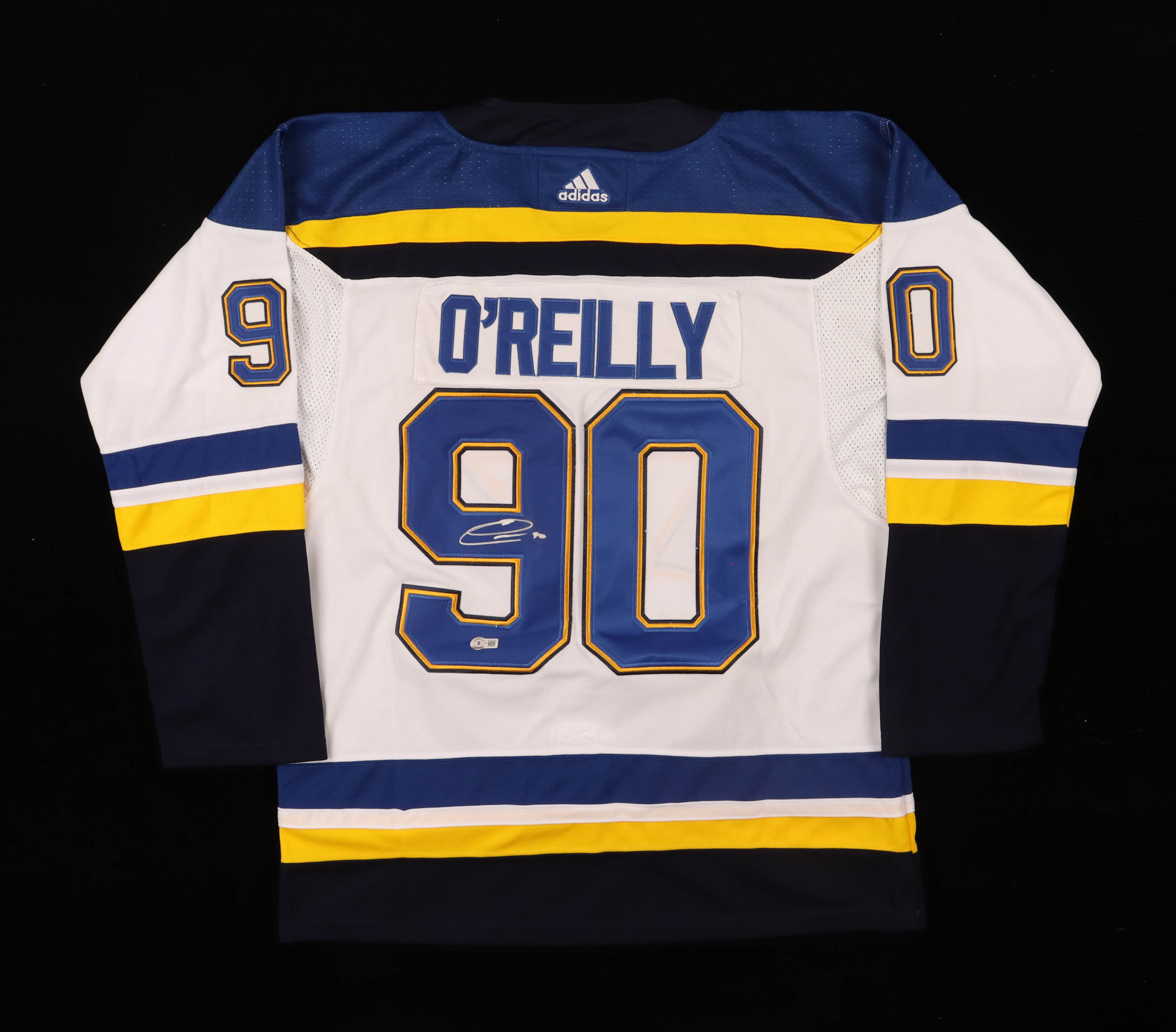 Adidas on-ice style jersey. Everything is sewn on, size 52. Hand-signed by Ryan O'Reilly (St. Louis Blues).