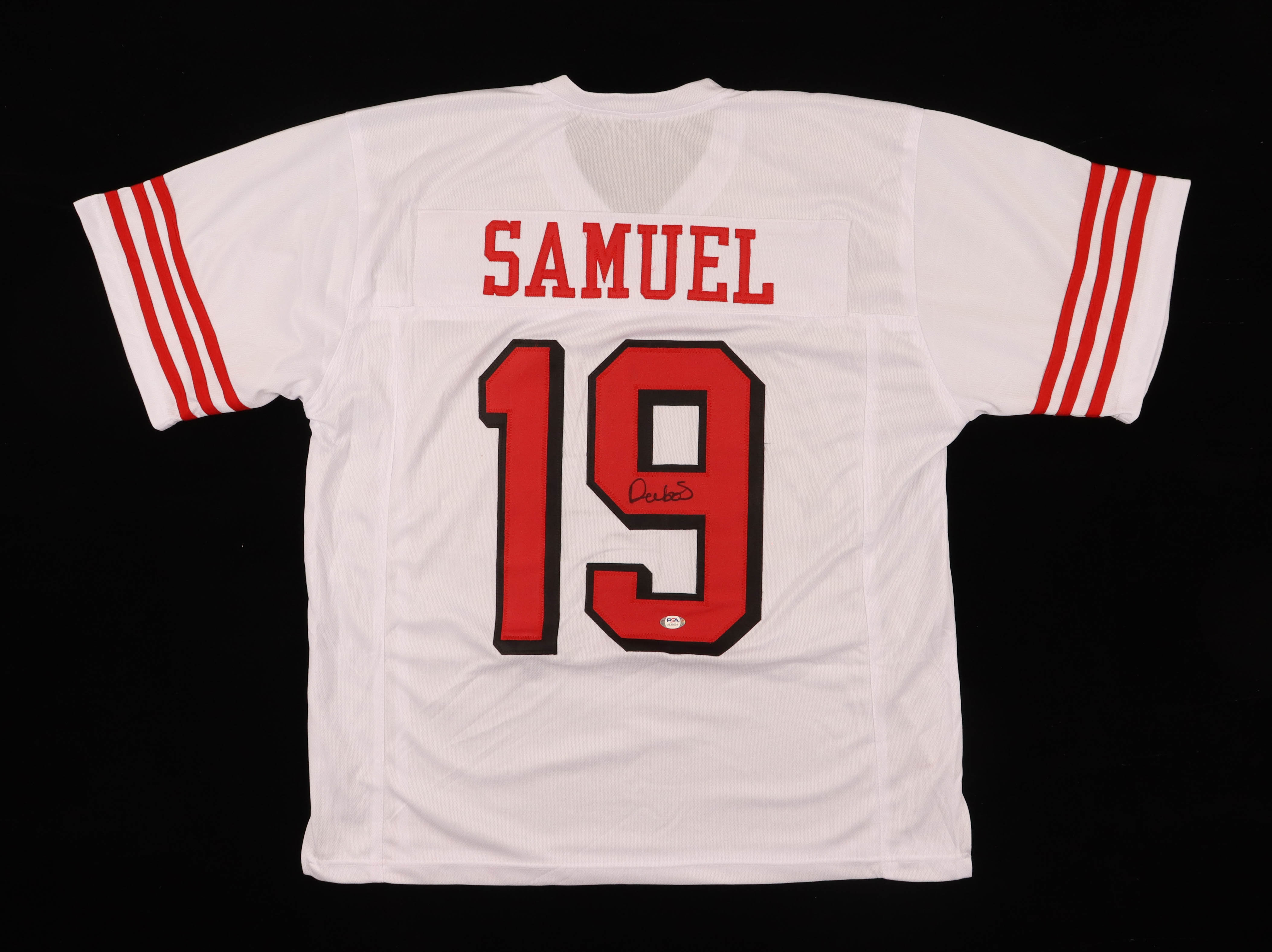 Custom on-field style jersey. Everything sewn on, size XL. Hand-signed by Deebo Samuel.