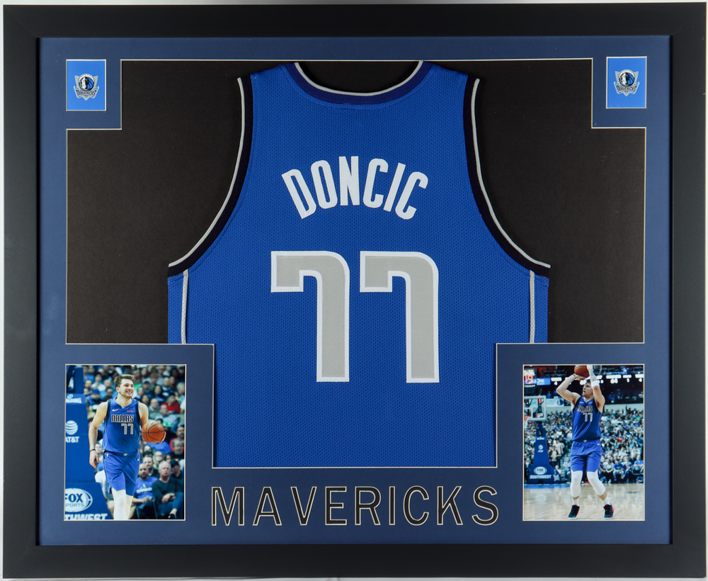 Custom framed display measures 35" x 43" in size and features a Luka Doncic jersey.