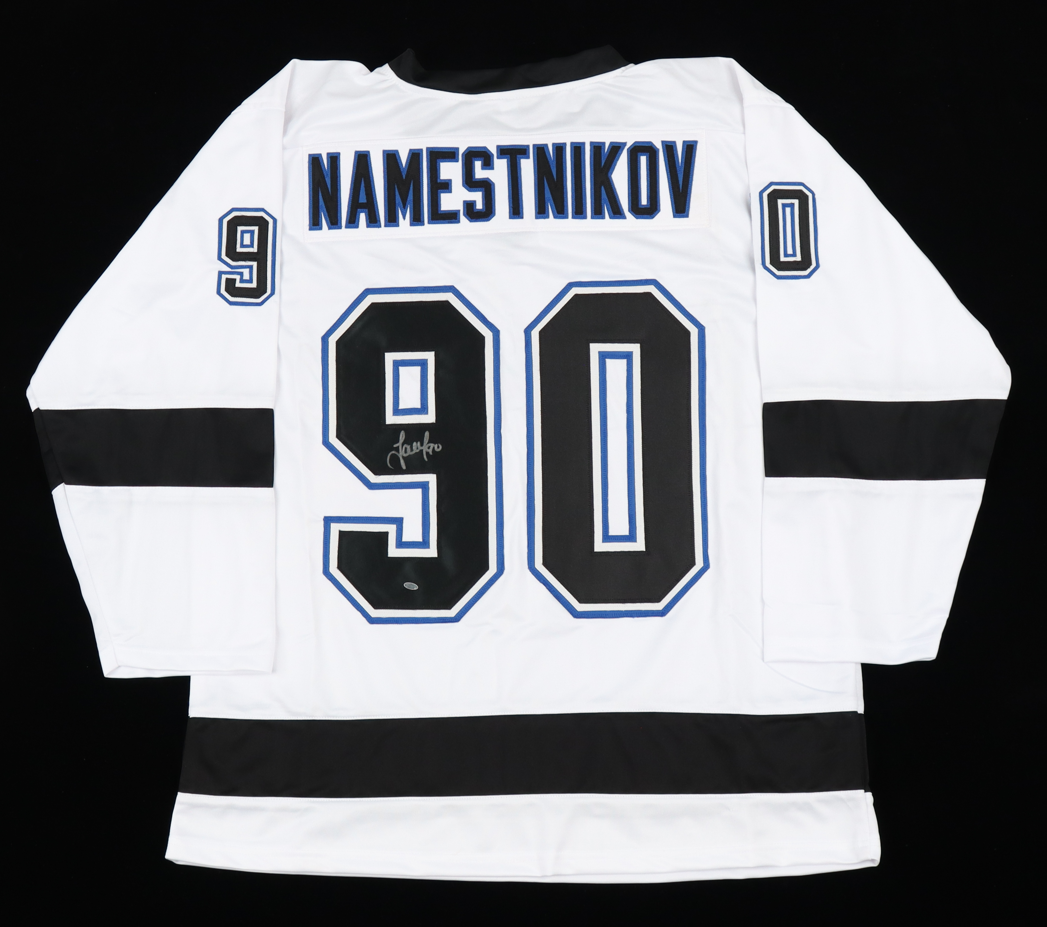 Custom on-ice style jersey. Everything is sewn on, size XL. Hand-signed by Vladislav Namestnikov.