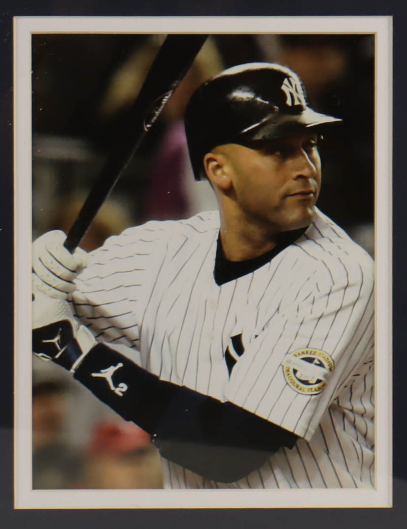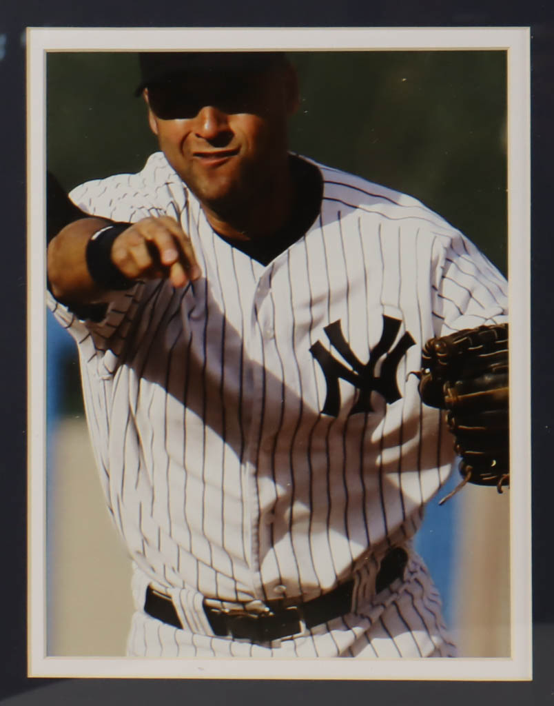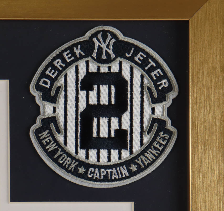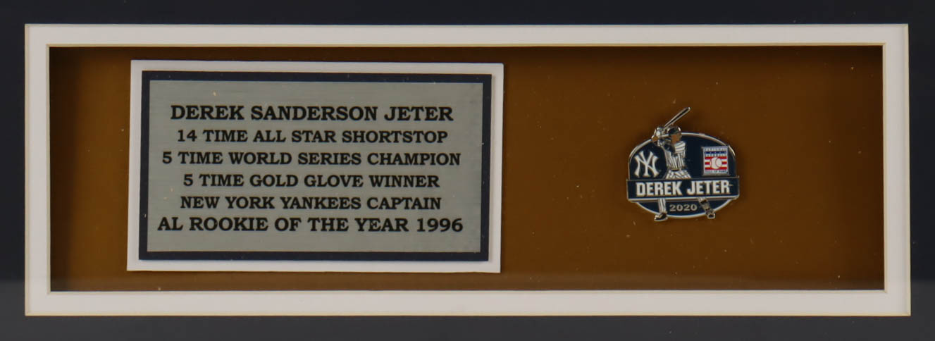 Custom framed display measures 32" x 36" in size and features Derek Jeter jersey (New York Yankees, HOF). Also features (2) Jeter Yankees patches and and Jeter HOF inductee pin. Please note, the item is unsigned.