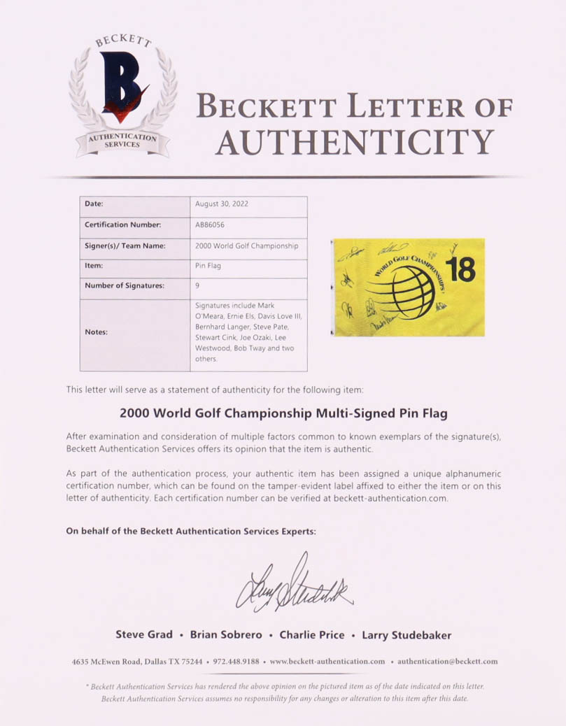 2000 World Golf Championship Pin Flag Multi-Signed by (9) with Mark O'Meara, Ernie Els, Davis Love III, Bernhard Langer (Beckett)