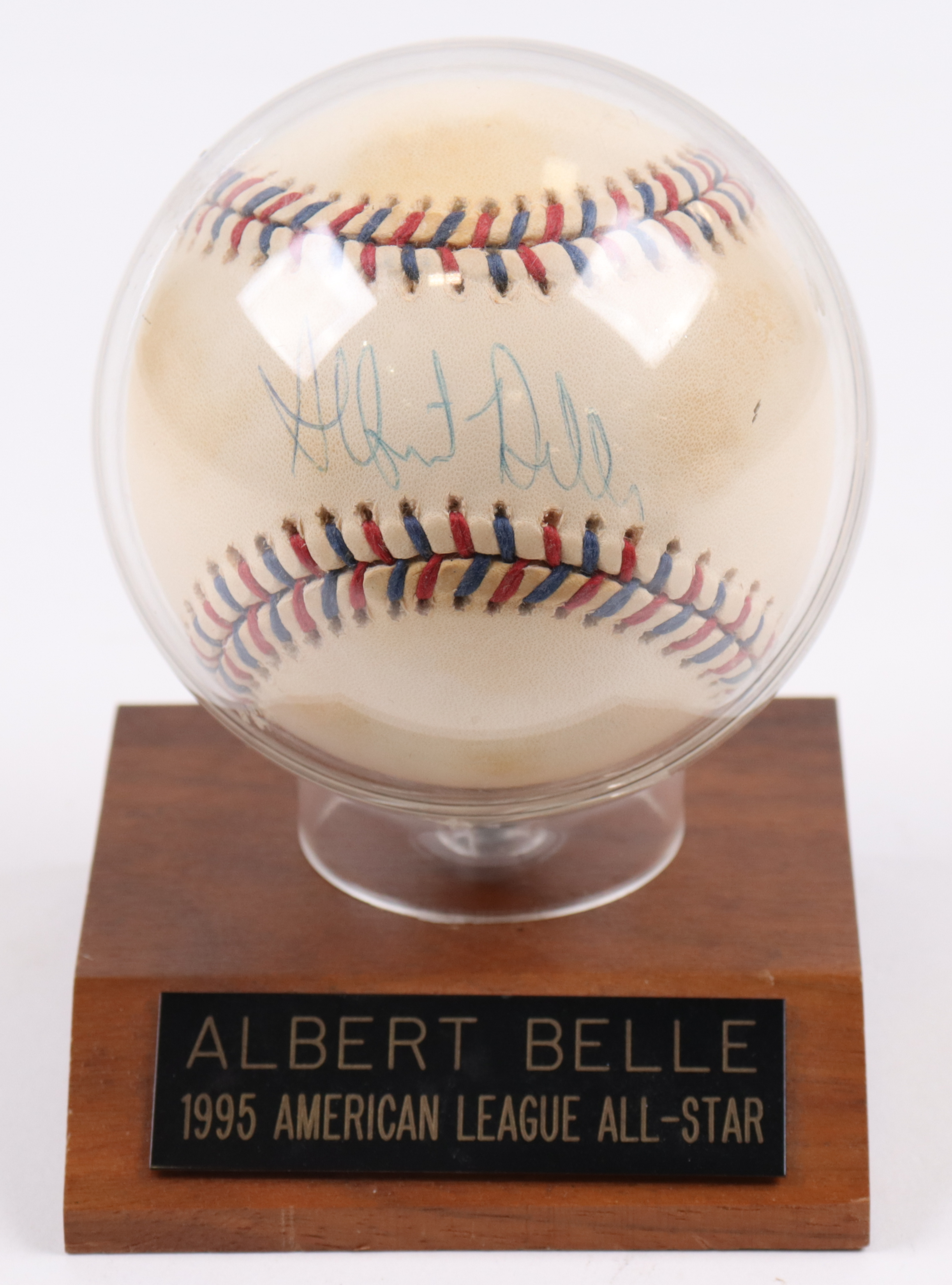 Rawlings Official 1995 All-Star Game Logo Baseball. Hand-signed by Albert Belle (Cleveland Indians). Display case is included as shown. Please note, baseball shows signs of natural toning.