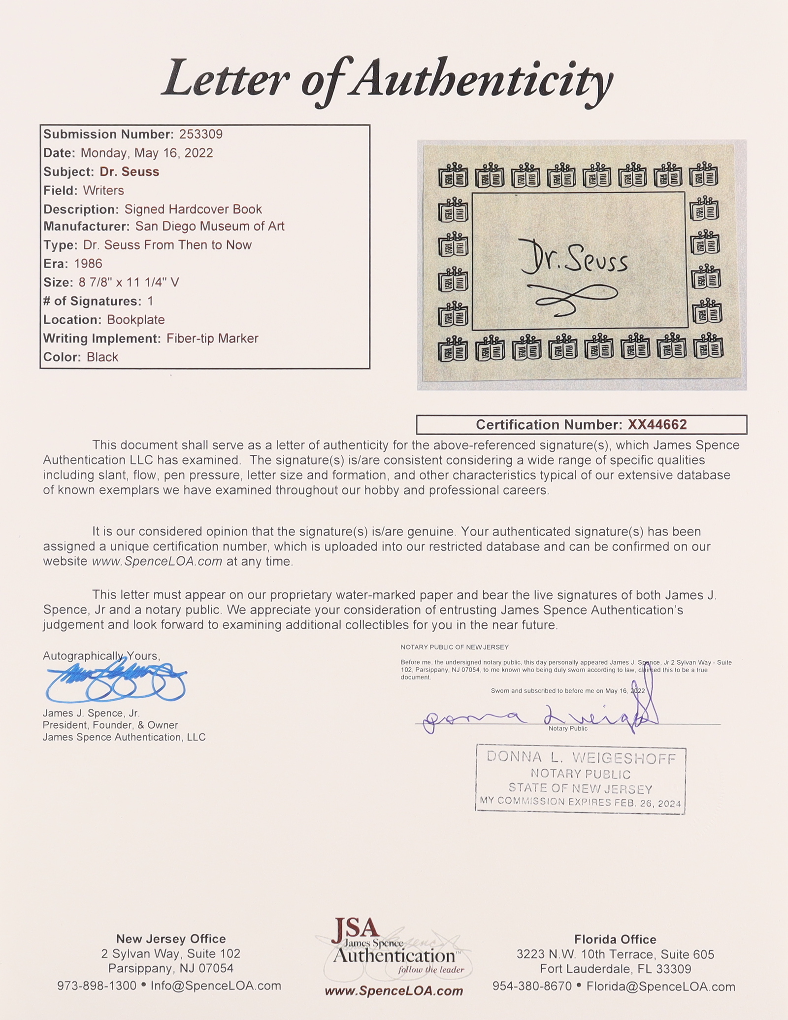 "Dr. Seuss, From Then to Now" hardcover book has been hand-signed on the inside cover page by Dr. Seuss (D.1991).