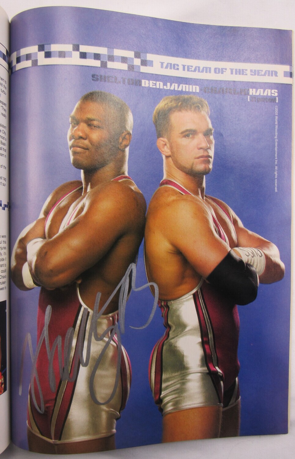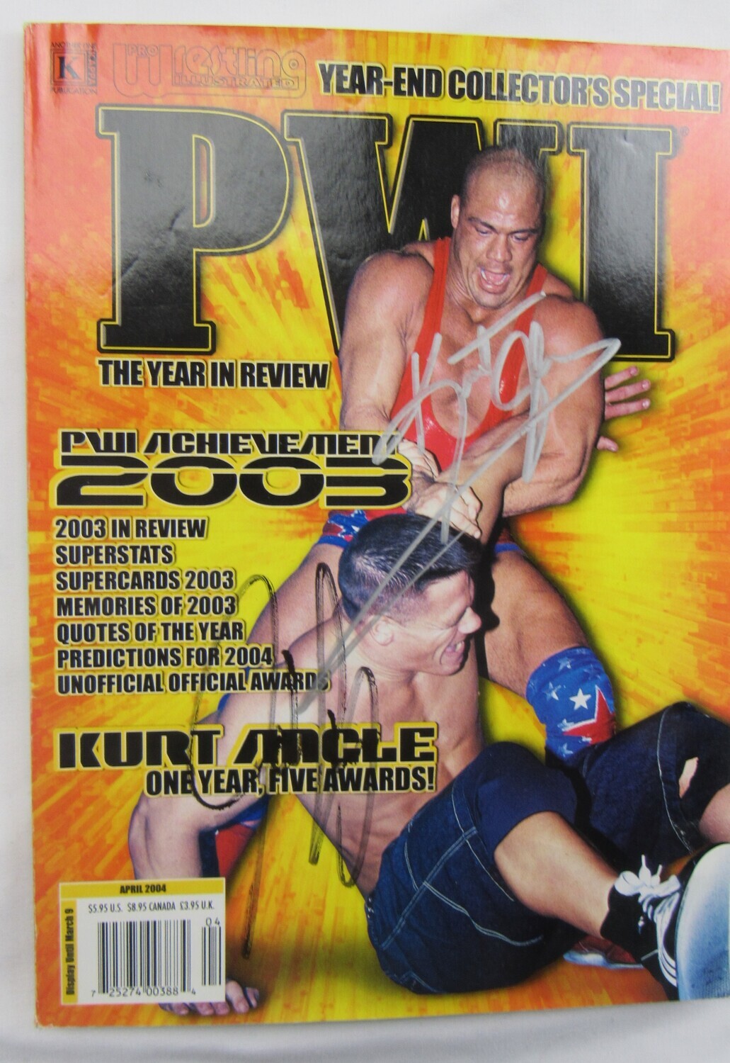 April 2004 issue of "Pro Wrestling Illustrated" magazine has been hand-signed by (4), with Kurt Angle (HOF), John Cena, Trish Stratus (HOF), and Shelton Benjamin.
