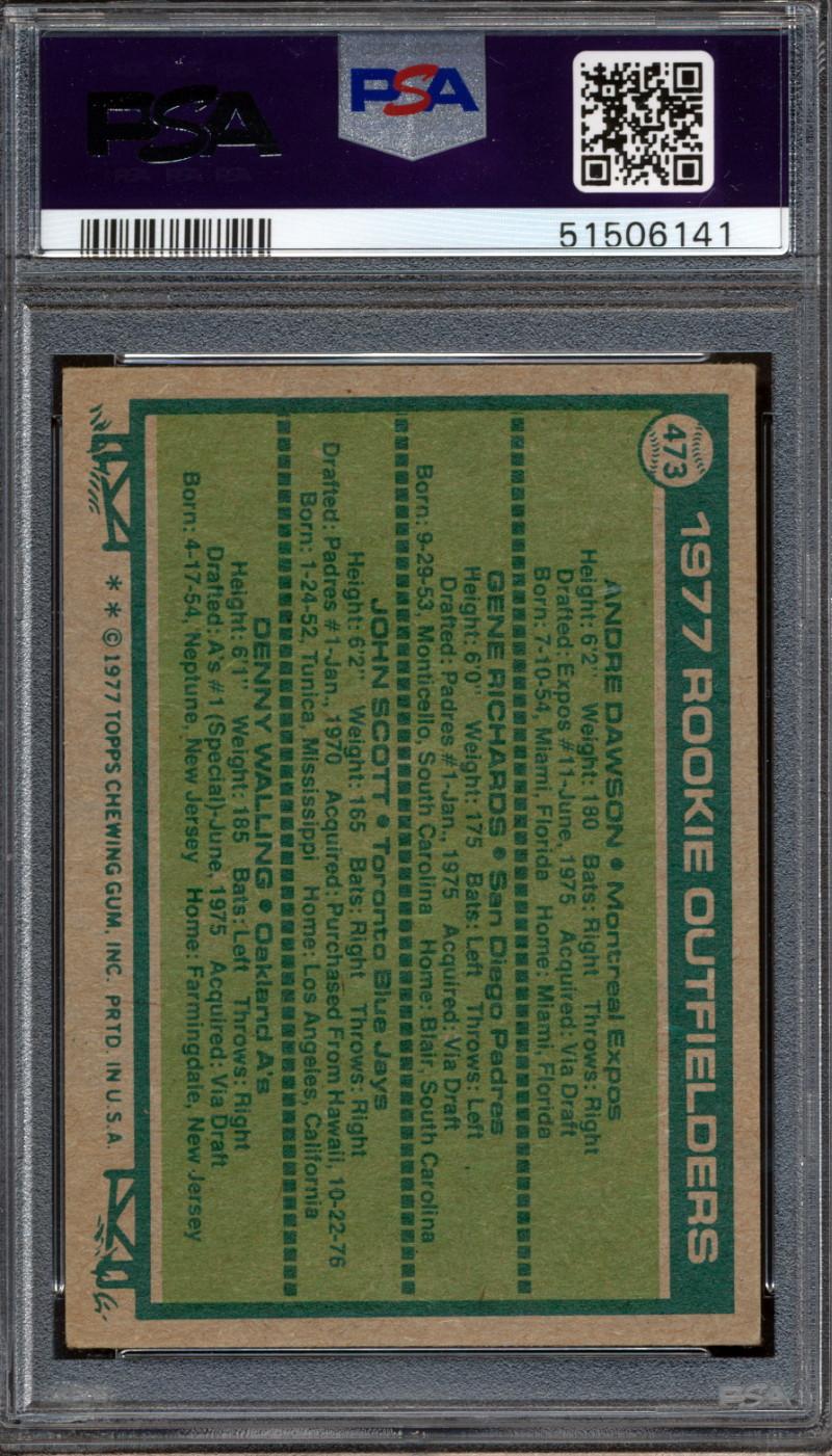 Andre Dawson Signed 1977 Topps #473 Rookie Outfielders / Andre Dawson RC / Gene Richards RC / John Scott / Denny Walling RC (PSA)