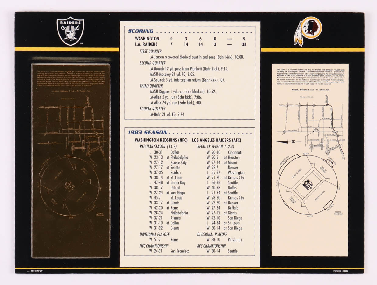 Official scorecard measures 9" x 12" in size with game stats on the reverse side. Features a Los Angeles Raiders vs Washington Redskins replica gold Super Bowl XVIII ticket.