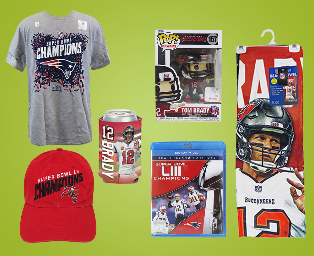 1 UNSIGNED NOVELTY ITEM of TOM BRADY or SB Championship Novelty of Patriots or Buccaneers Per Box!! (Funko, T-Shirts, Decal, etc.)