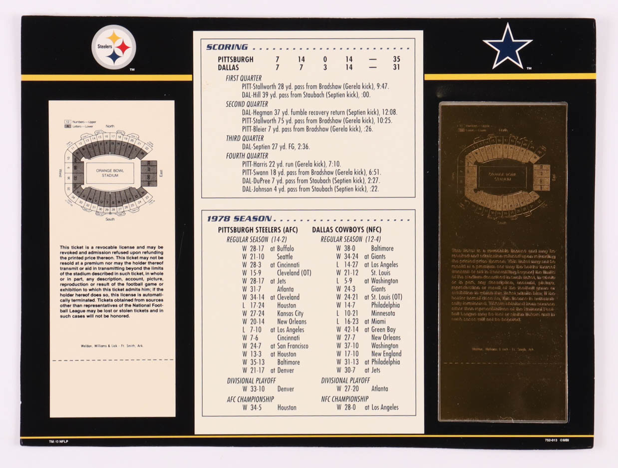 Official scorecard measures 9" x 12" in size with game stats on the reverse side. Features a Pittsburgh Steelers vs Dallas Cowboys replica gold Super Bowl XIII ticket.