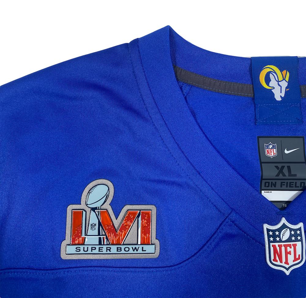 Nike Super Bowl LVI on-field style jersey. Everything is printed on, size XL. Hand-signed and inscribed by Cooper Kupp (Los Angeles Rams).