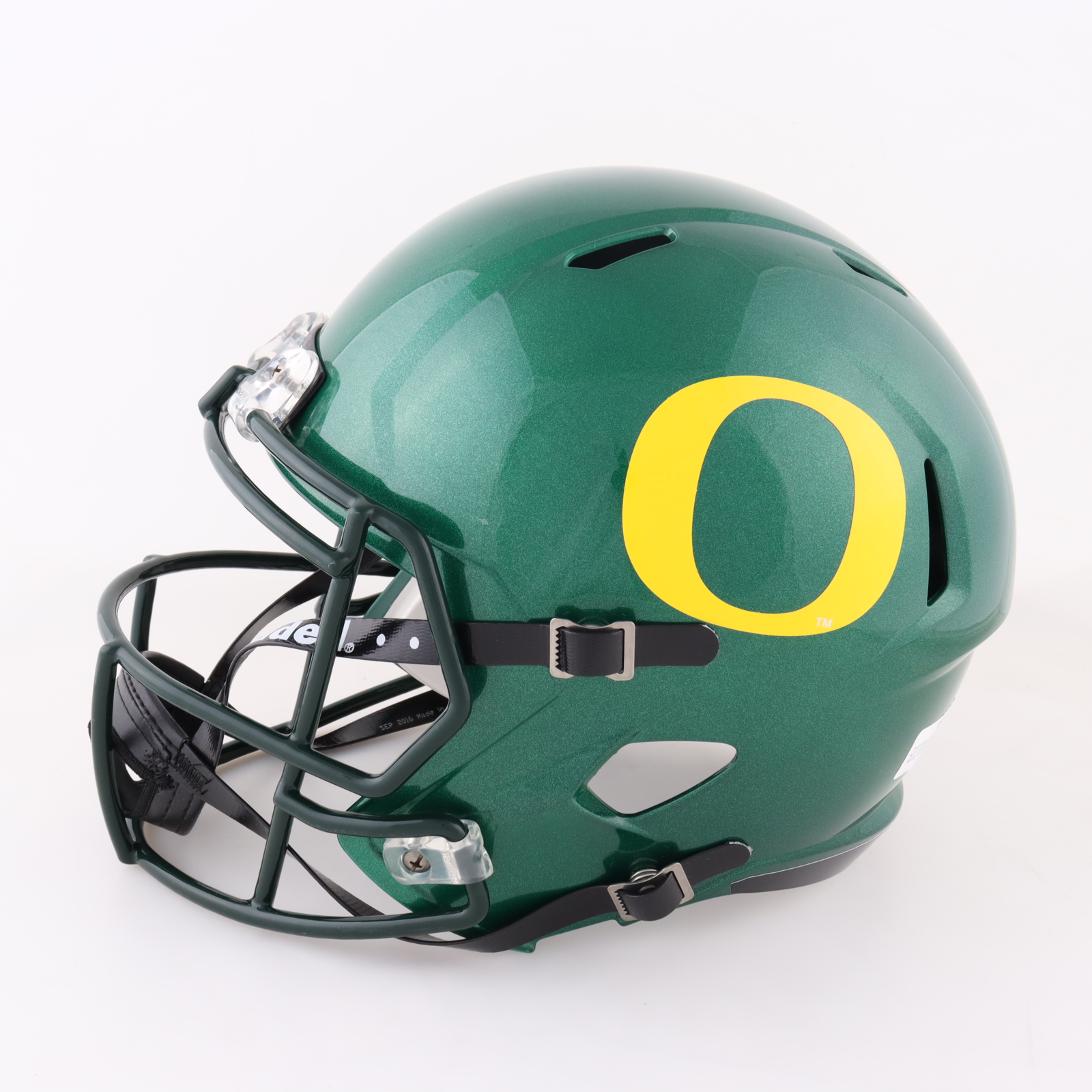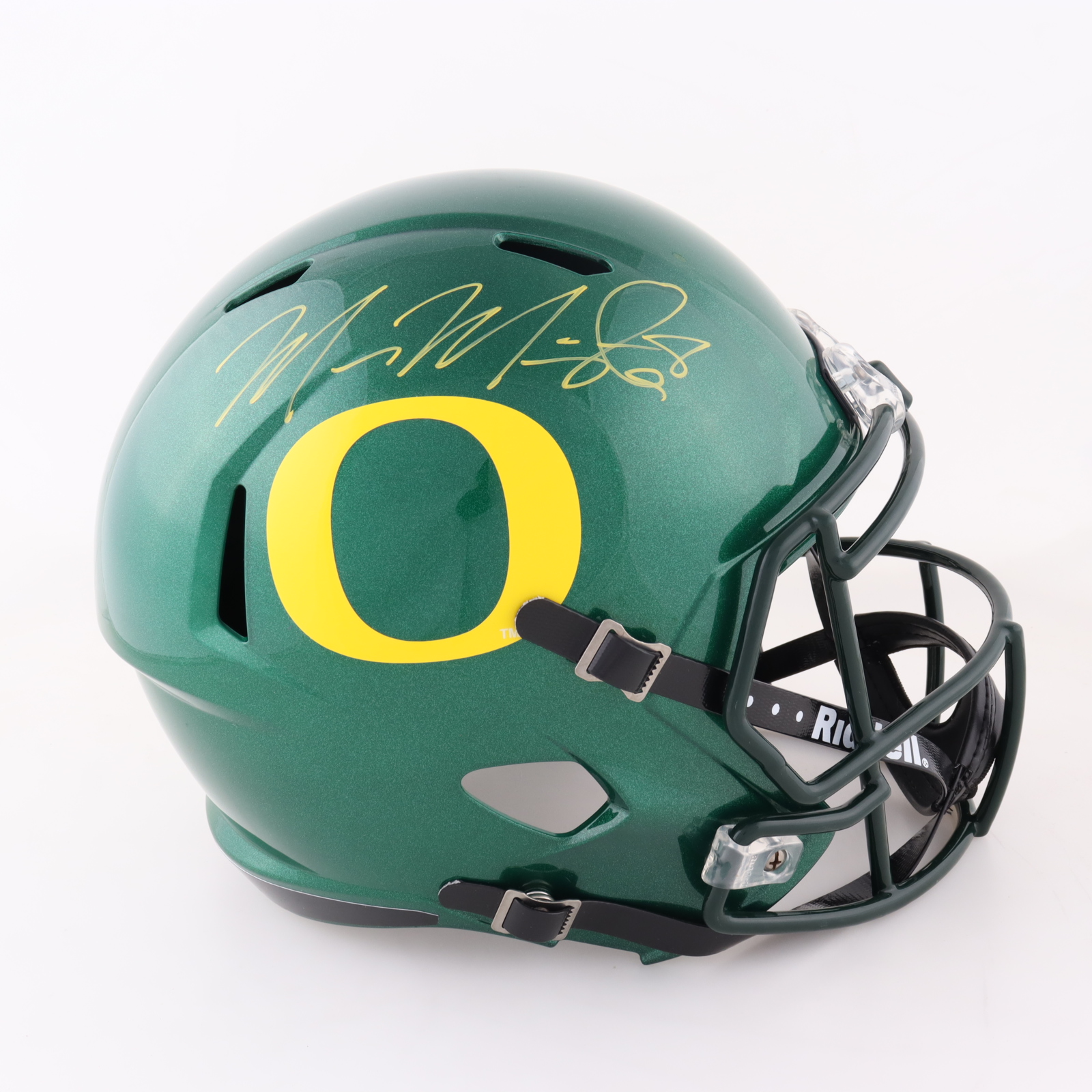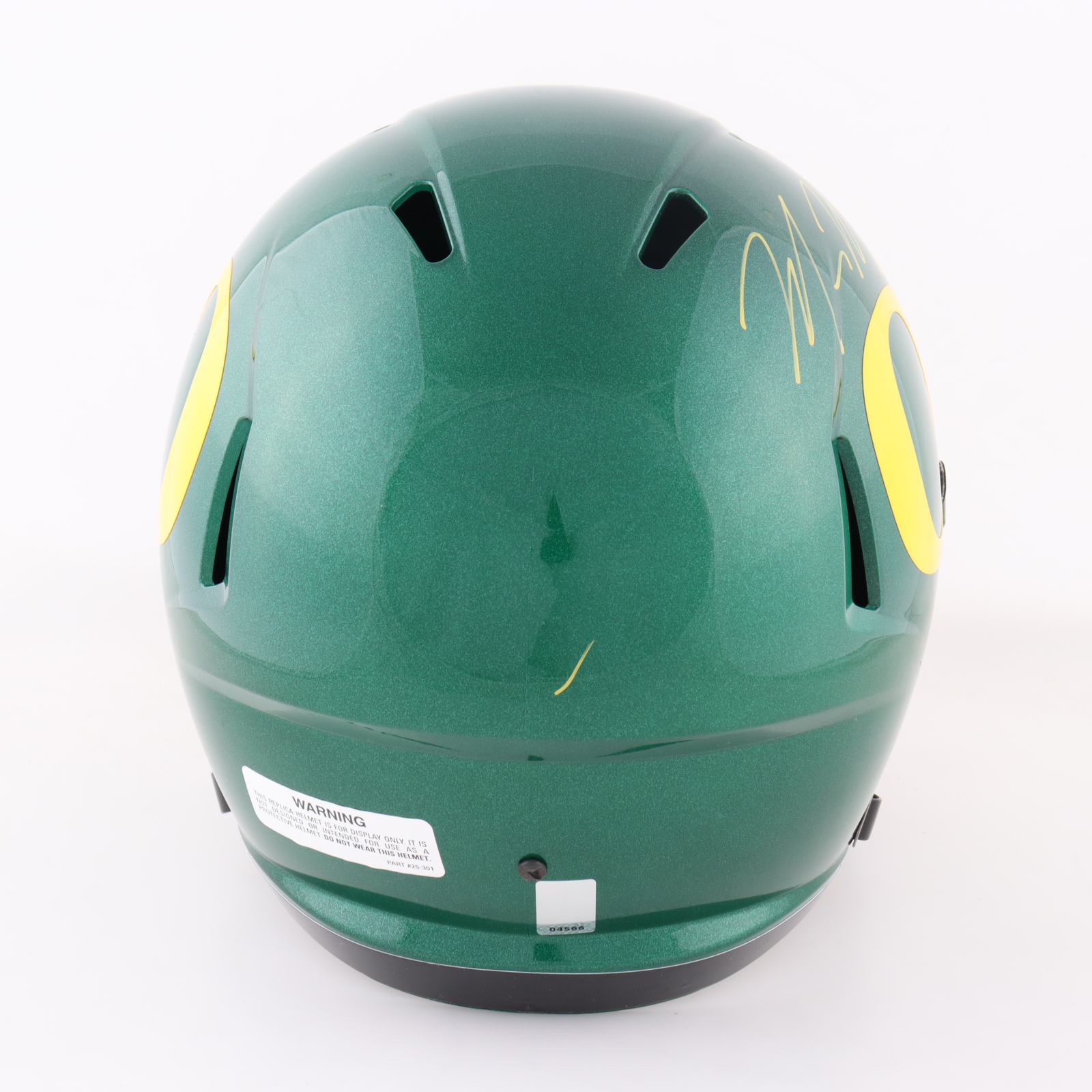 Riddell Oregon Ducks full-size replica Speed helmet. Hand-signed by Marcus Mariota. Please note that there is a stray pen mark on the back of the helmet.