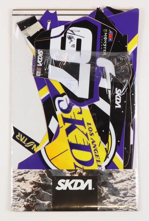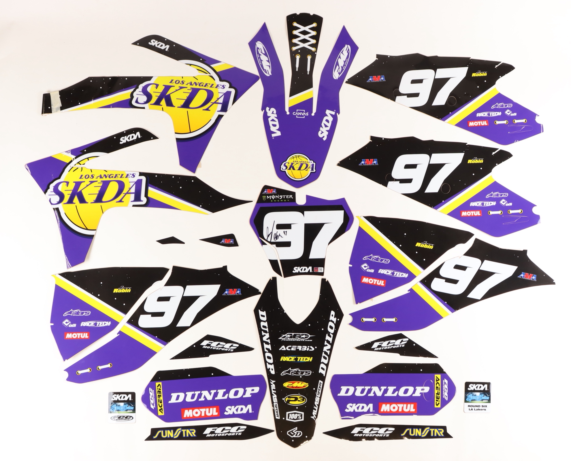 This lot includes a full set of bike decals from the 2022 'Sport Series' which were issued to Jerry Robin. This set was issued for Anaheim, California (Los Angeles Lakers design). The main number plate is hand-signed by Robin.