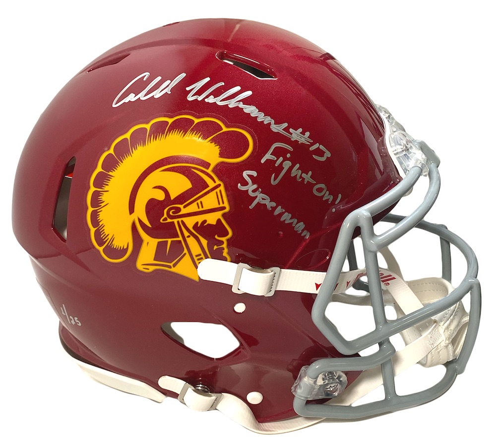 Riddell USC Trojans full-size authentic, on-field Speed helmet. Hand-signed and inscribed by Caleb Williams. The helmet is limited edition and you will receive a random # / 25 from the edition.