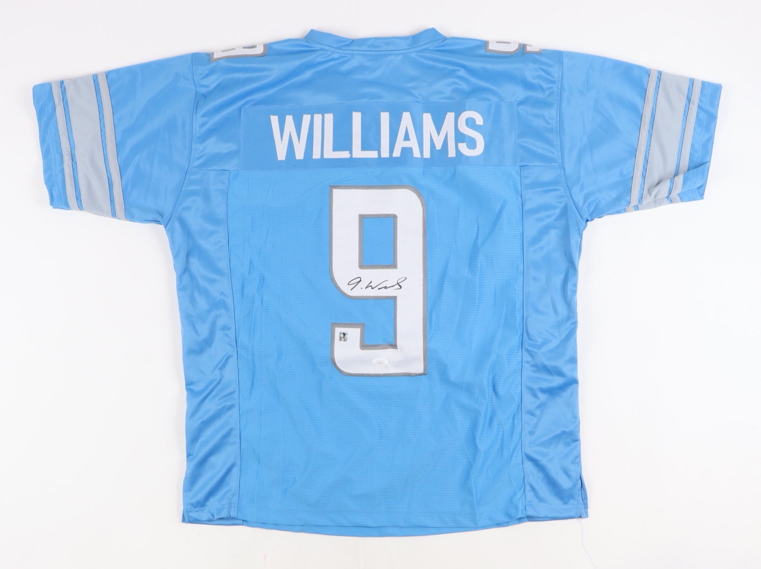 Custom on-field style jersey. Everything is sewn on, size XL. Hand-signed by Jameson Williams.