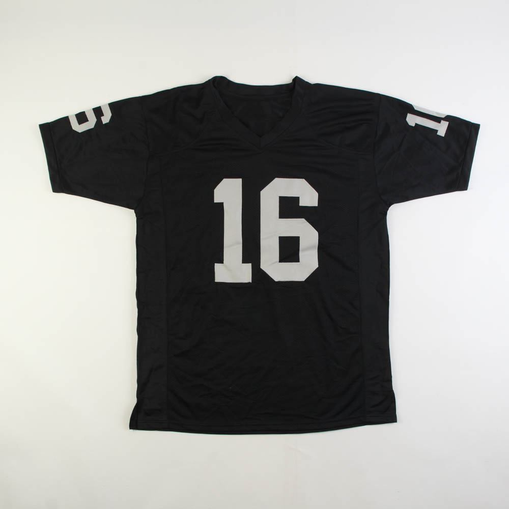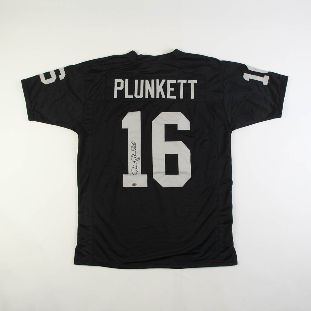 Custom on-field style jersey. Everything is sewn on, size XL. Hand-signed by Jim Plunkett.