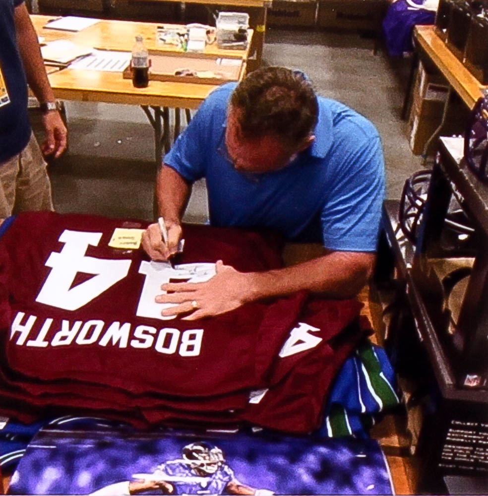 Custom on-field style jersey. Everything sewn on, size XL . Hand-signed in black felt tip pen by Brian Bosworth (Seahawks).