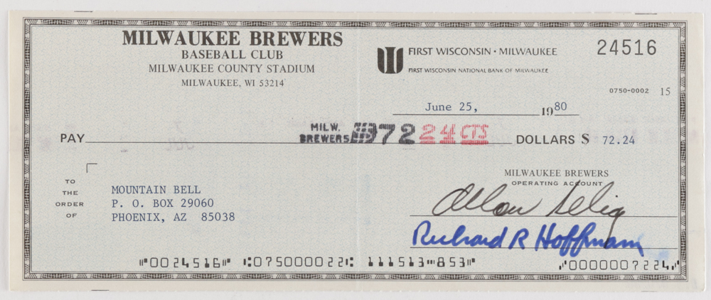 Personal bank check is dated June 25th, 1980 and has been hand-signed with his full name signature by Bud Selig (HOF).