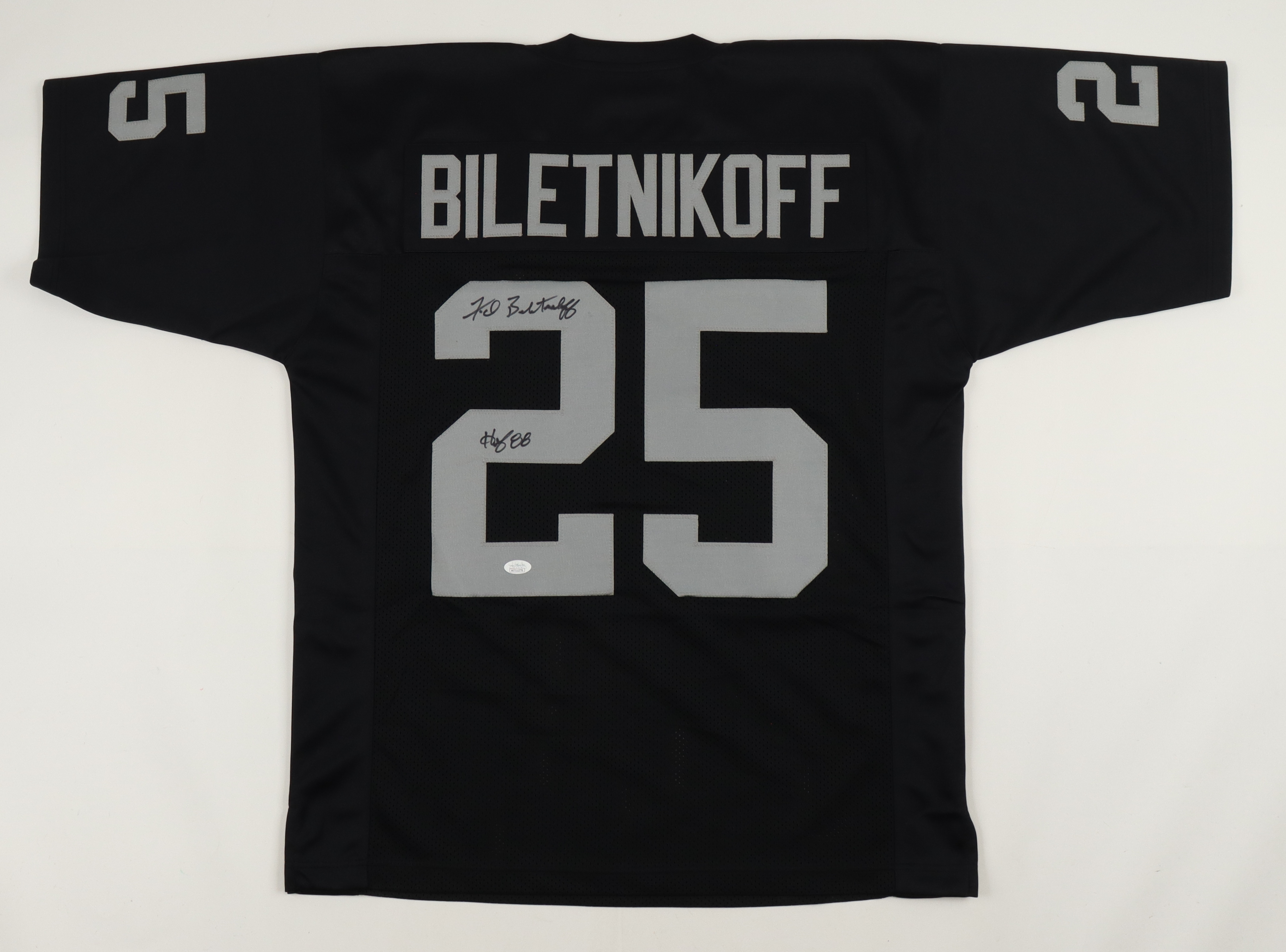 Custom on-field style jersey. Everything is sewn on, size XL. Hand-signed and inscribed by Fred Biletnikoff (HOF).