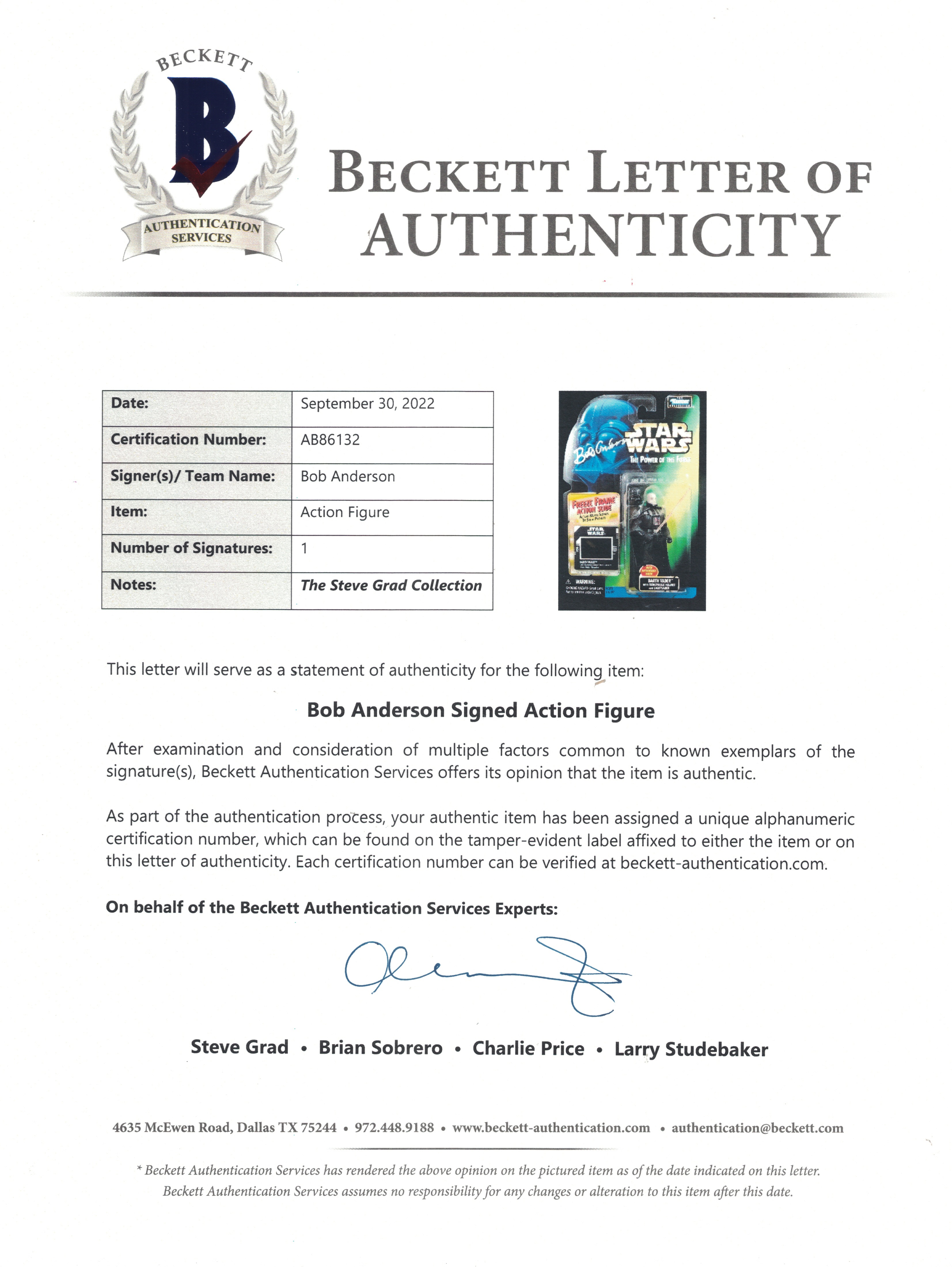 Bob Anderson Signed "STAR WARS: The Power of the Force" Darth Vader Action Figure (Beckett)