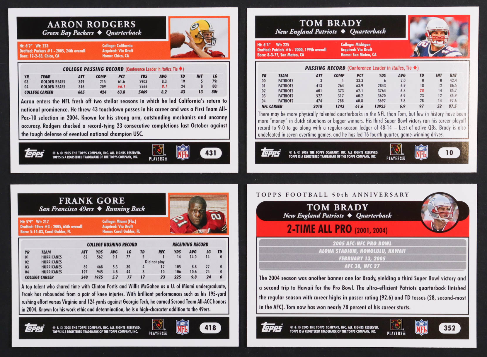 2005 Topps Football Complete Set of (446) Cards with Aaron Rodgers #431 RC, Tom Brady #10, Frank Gore #418 RC, Tom Brady #352 AP