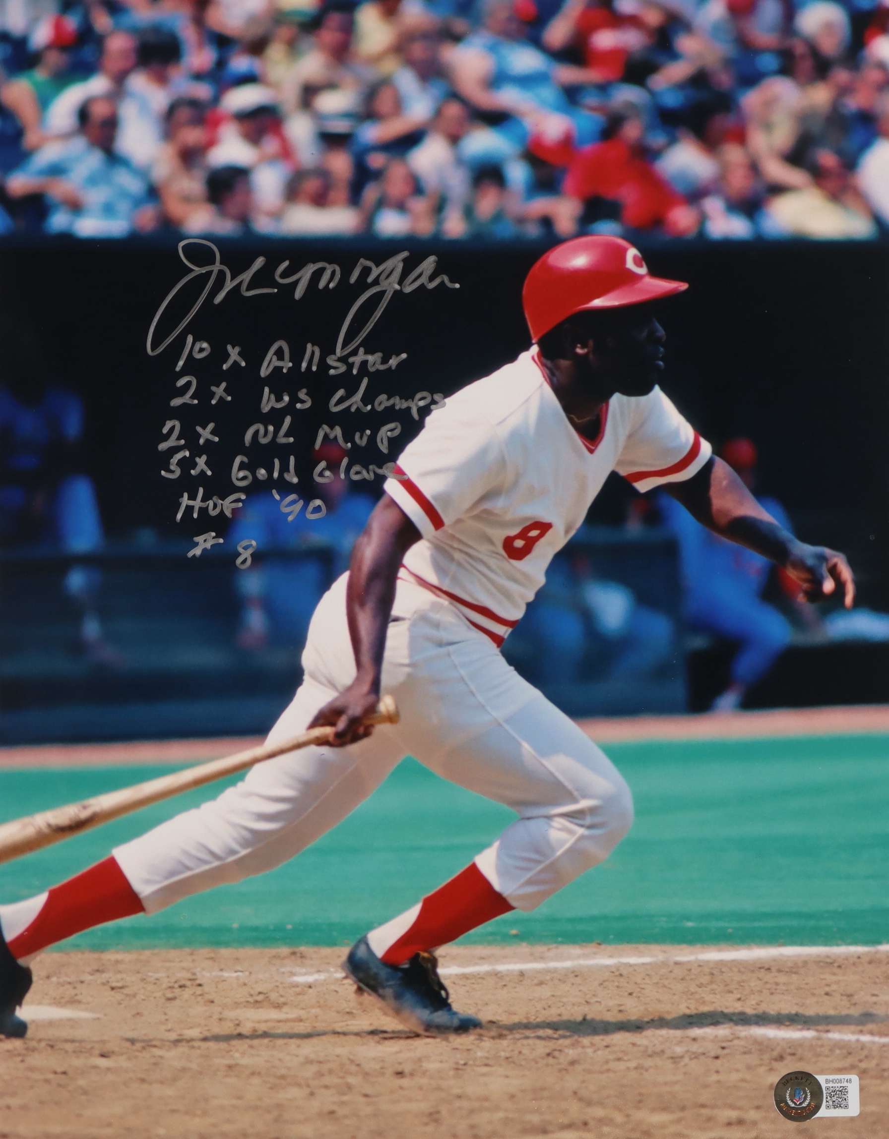 Joe Morgan Signed Reds 11x14 Photo with Multiple Career Stat Inscriptions (Beckett)