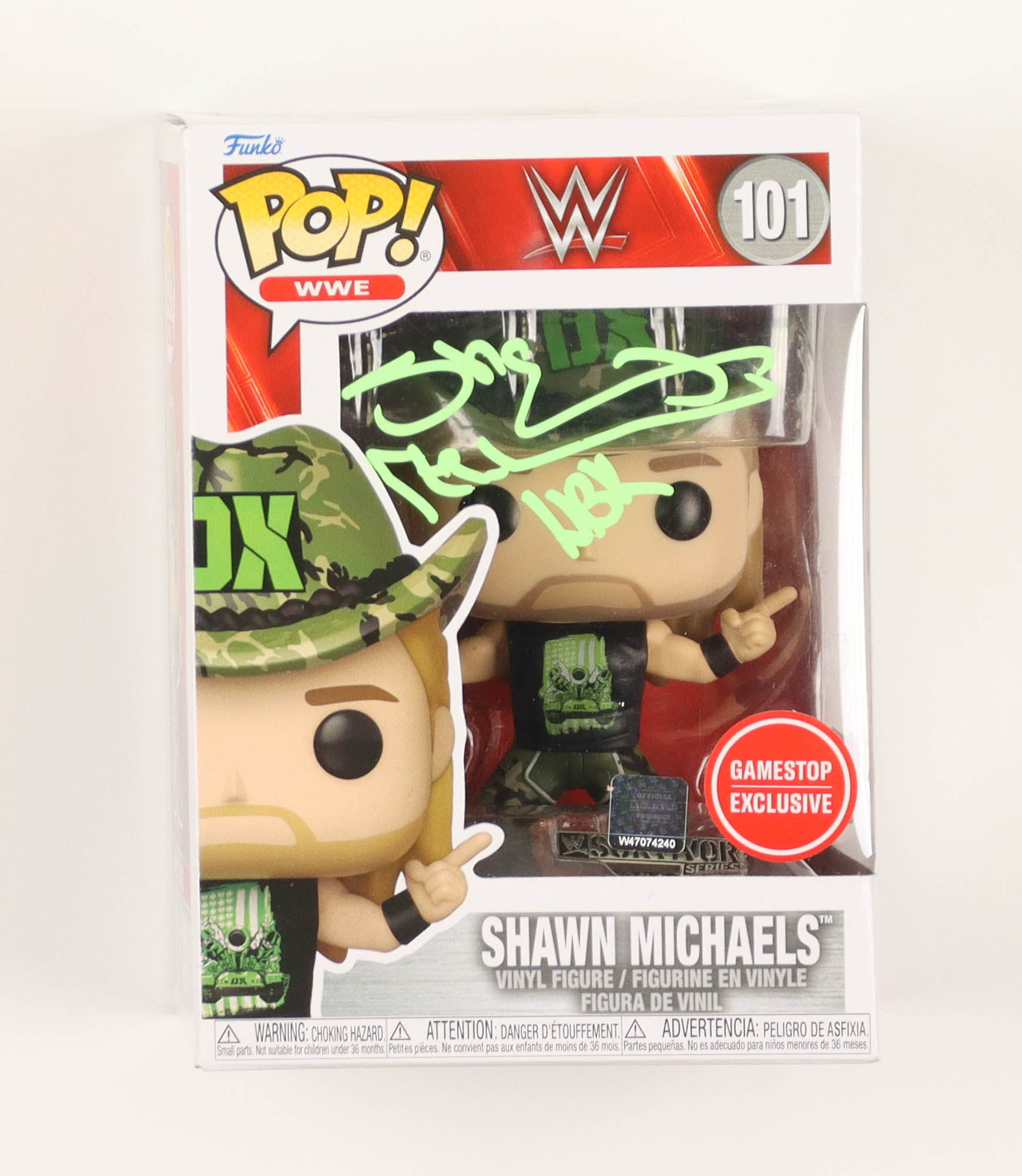 Funko Pop! vinyl figure measures approximately 4" tall. Hand-signed and inscribed on the original packaging by Shawn Michaels.