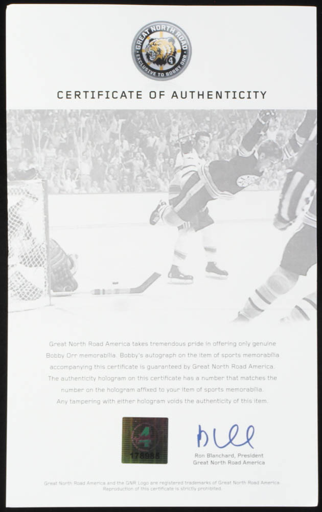 The autograph includes an official Bobby Orr hologram and matching COA from Great North Road for authenticity purposes.