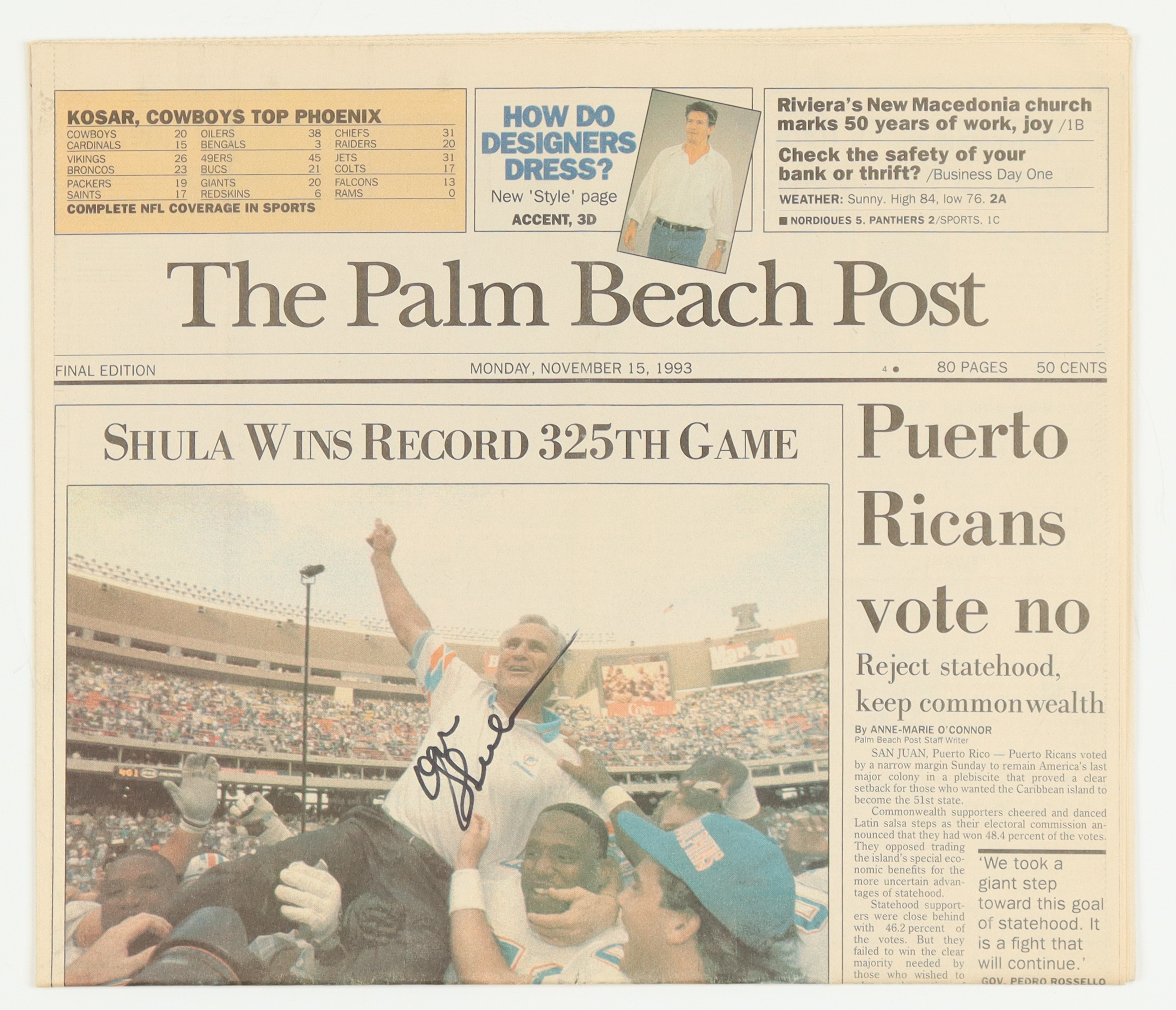 November 15, 1993 Issue of The Palm Beach Post Newspaper has been hand-signed by Don Shula (D. 2020, HOF).
