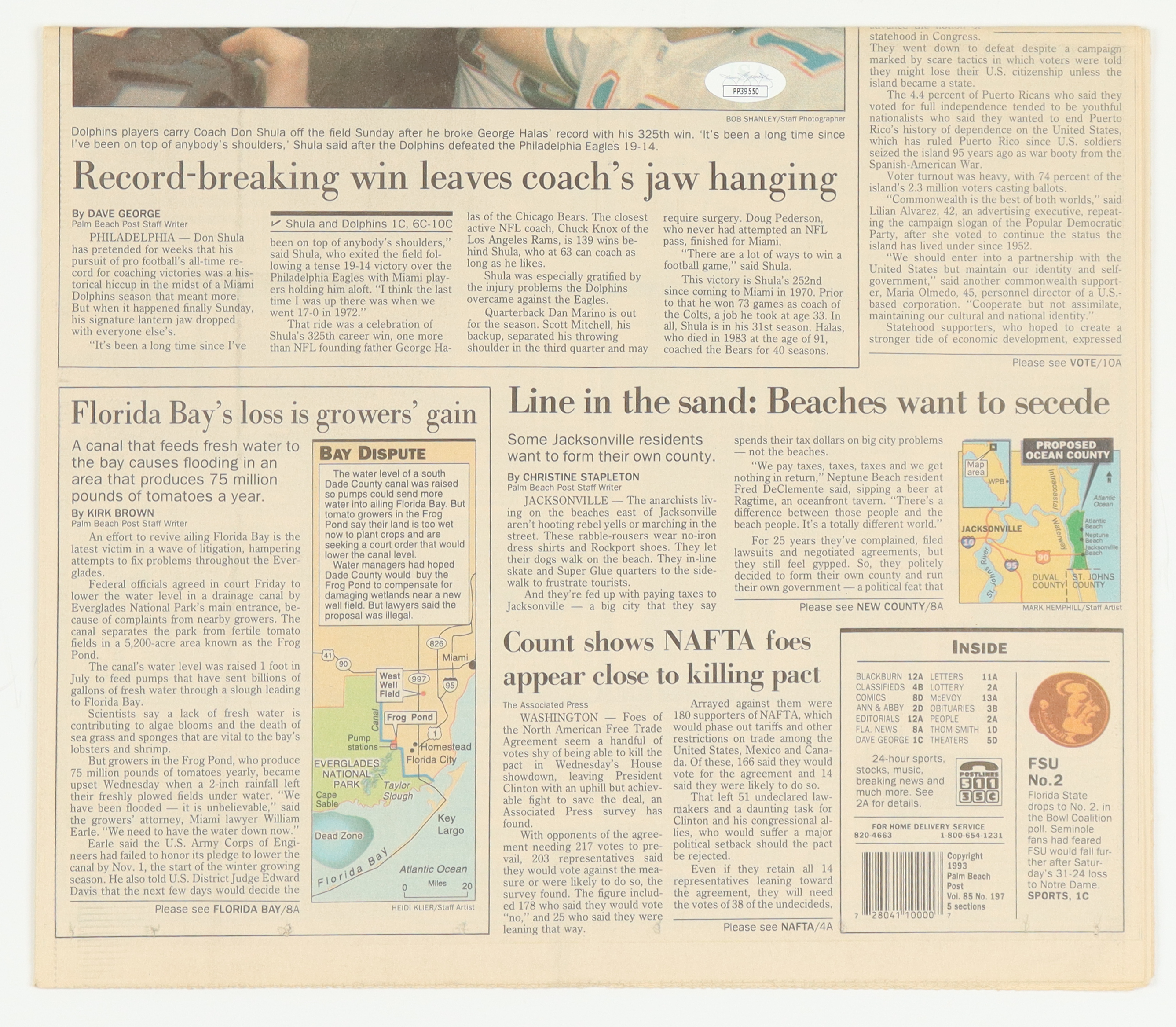 Don Shula Signed 1993 The Palm Beach Post Newspaper (JSA)