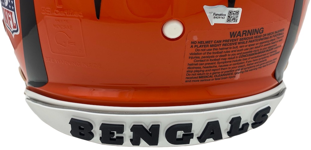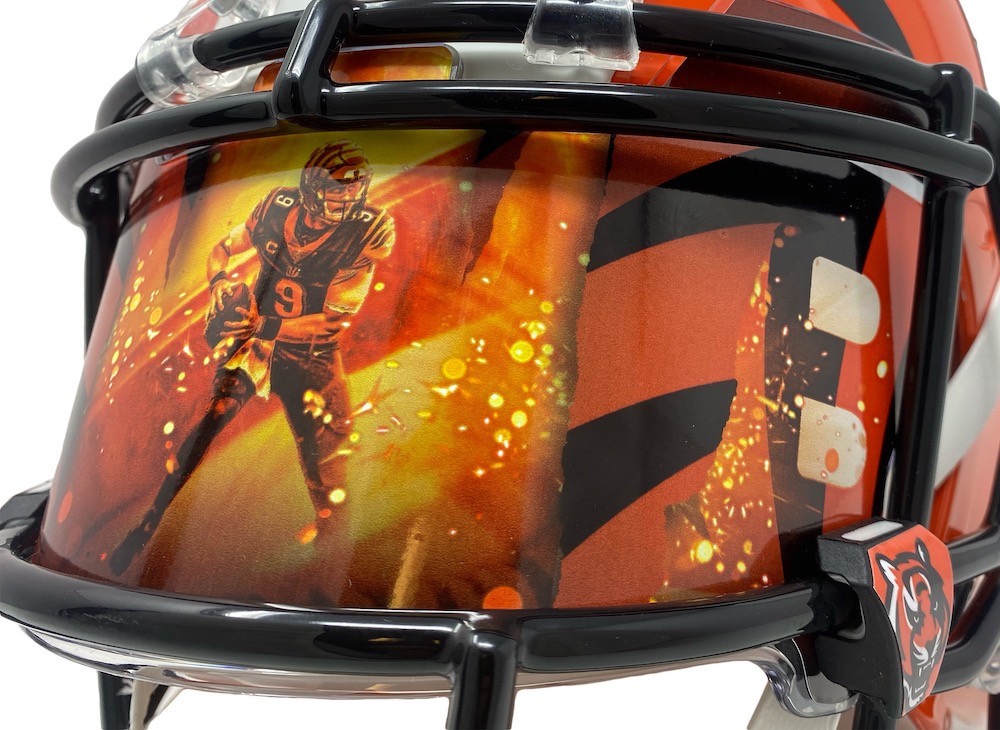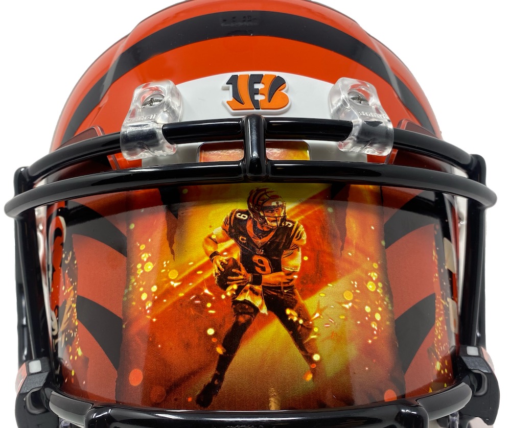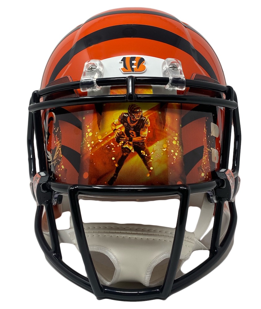 Riddell Cincinnati Bengals full-size authentic on-field Speed helmet. Hand-signed and inscribed by Joe Burrow. Includes attached custom visor as shown.