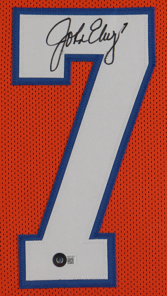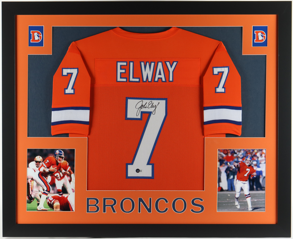 Custom frame measures approximately 35" x 43" in size and features a jersey which has been hand-signed in by John Elway (HOF).